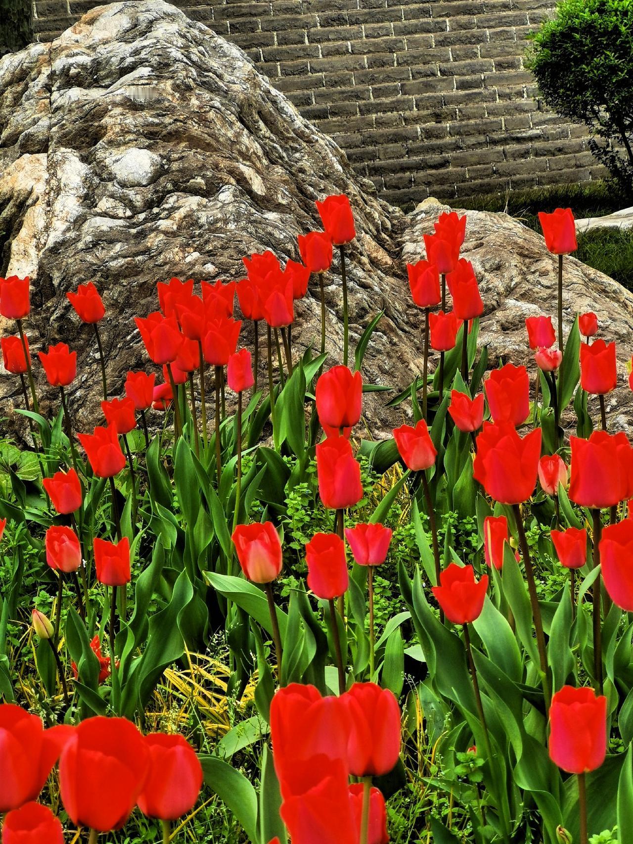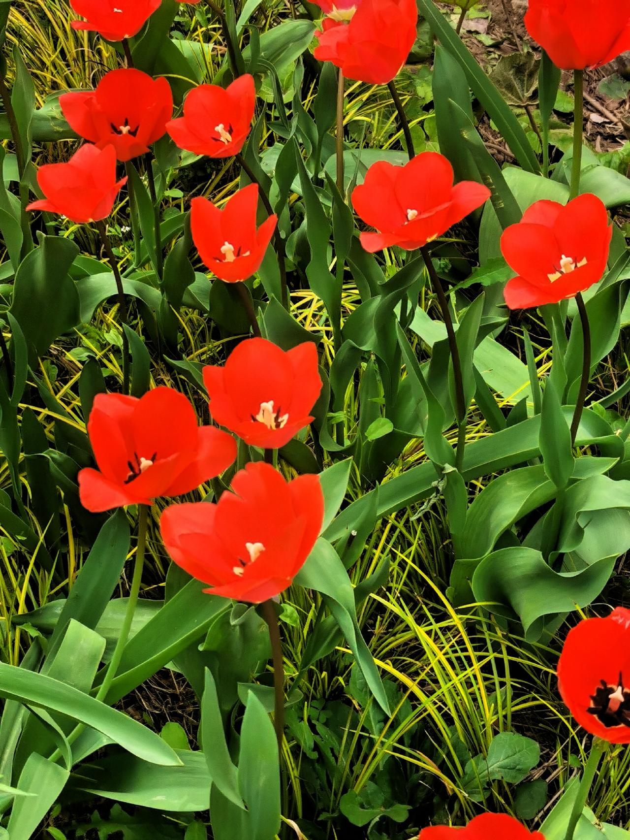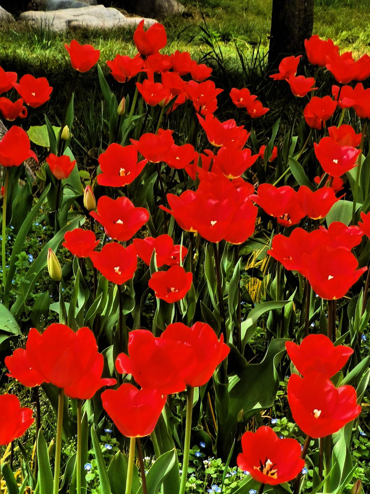 今日漫步公园,不经意间邂逅了一片盛放的红色郁金香。