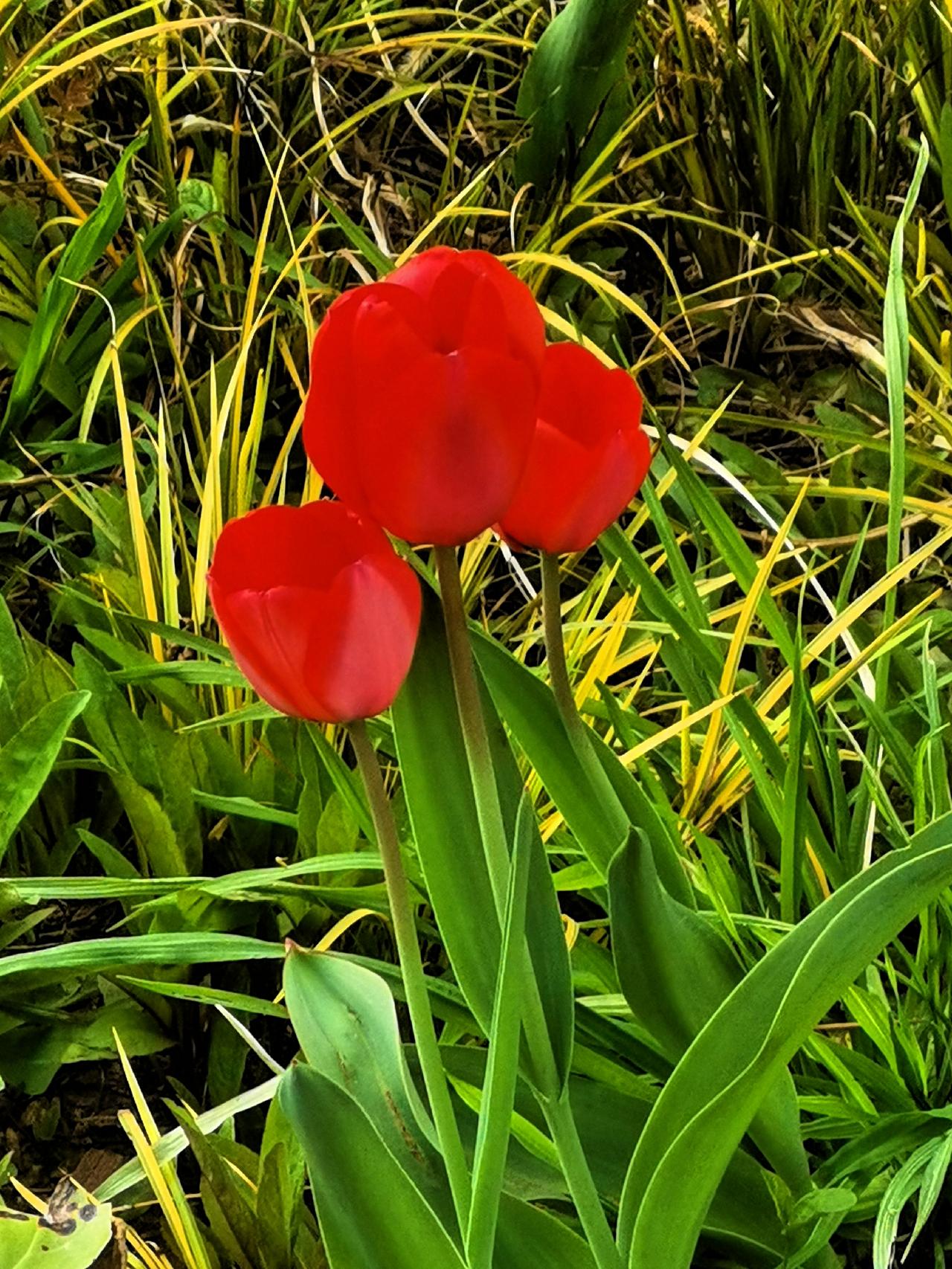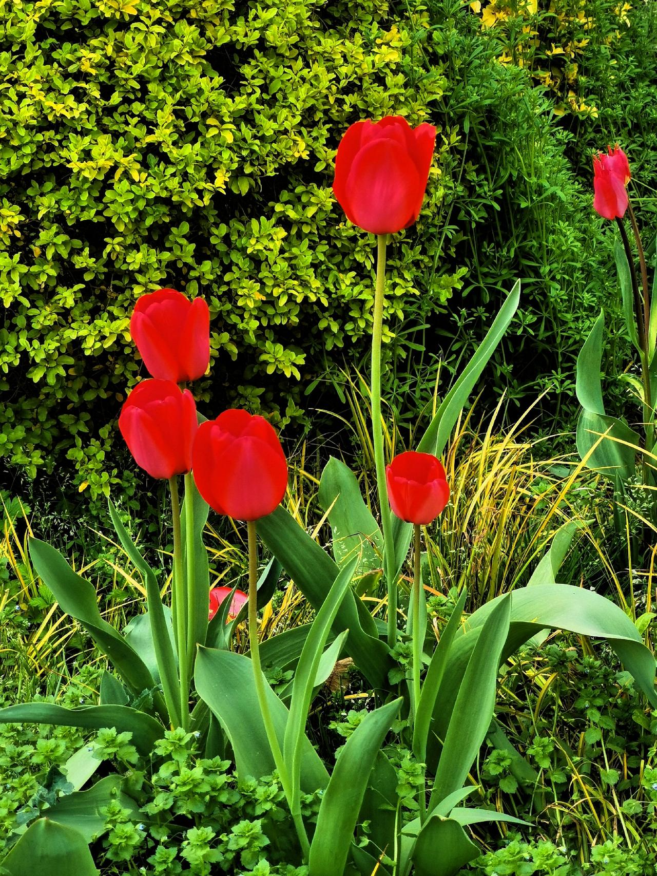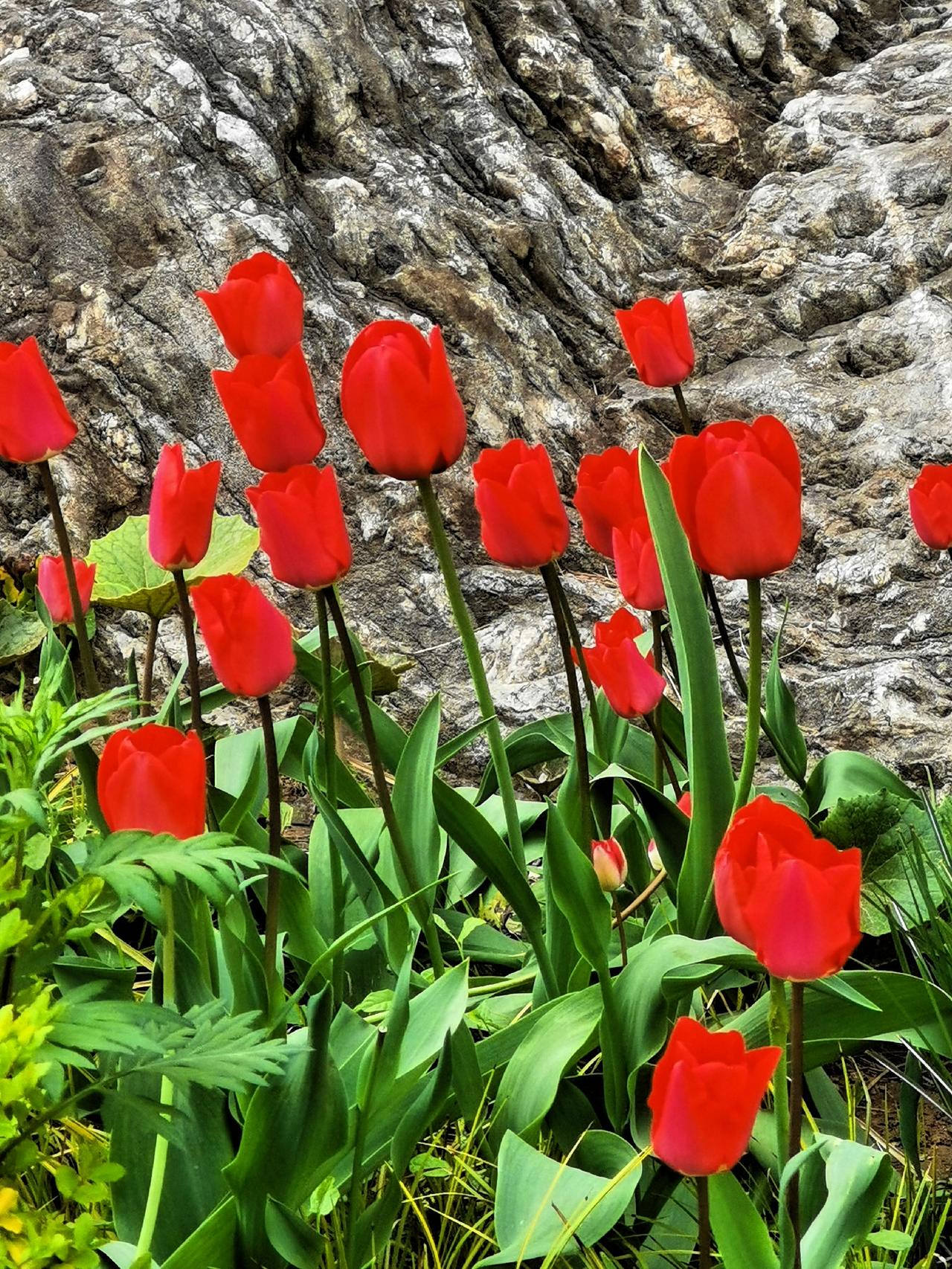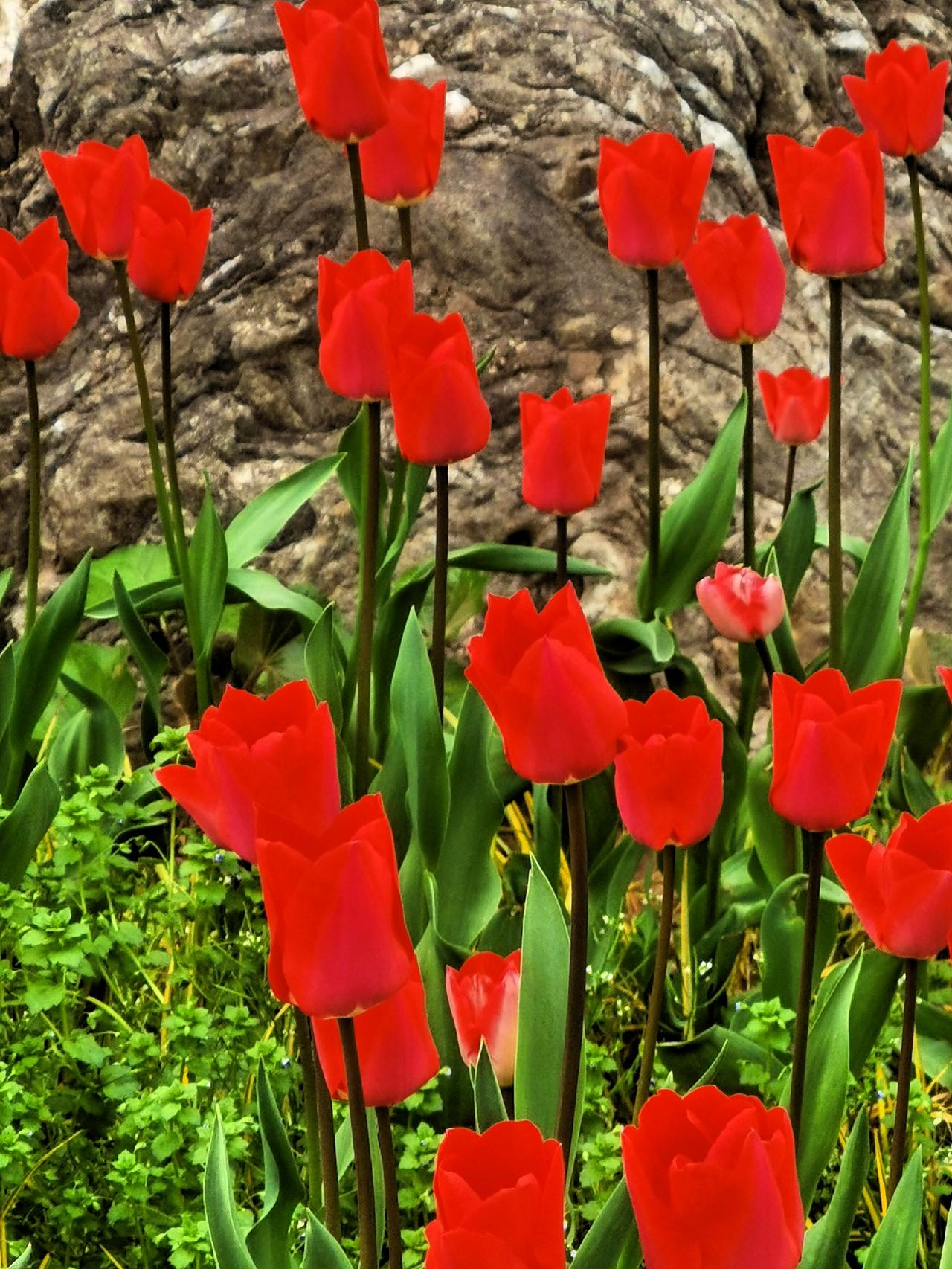 今日漫步公园,不经意间邂逅了一片盛放的红色郁金香。