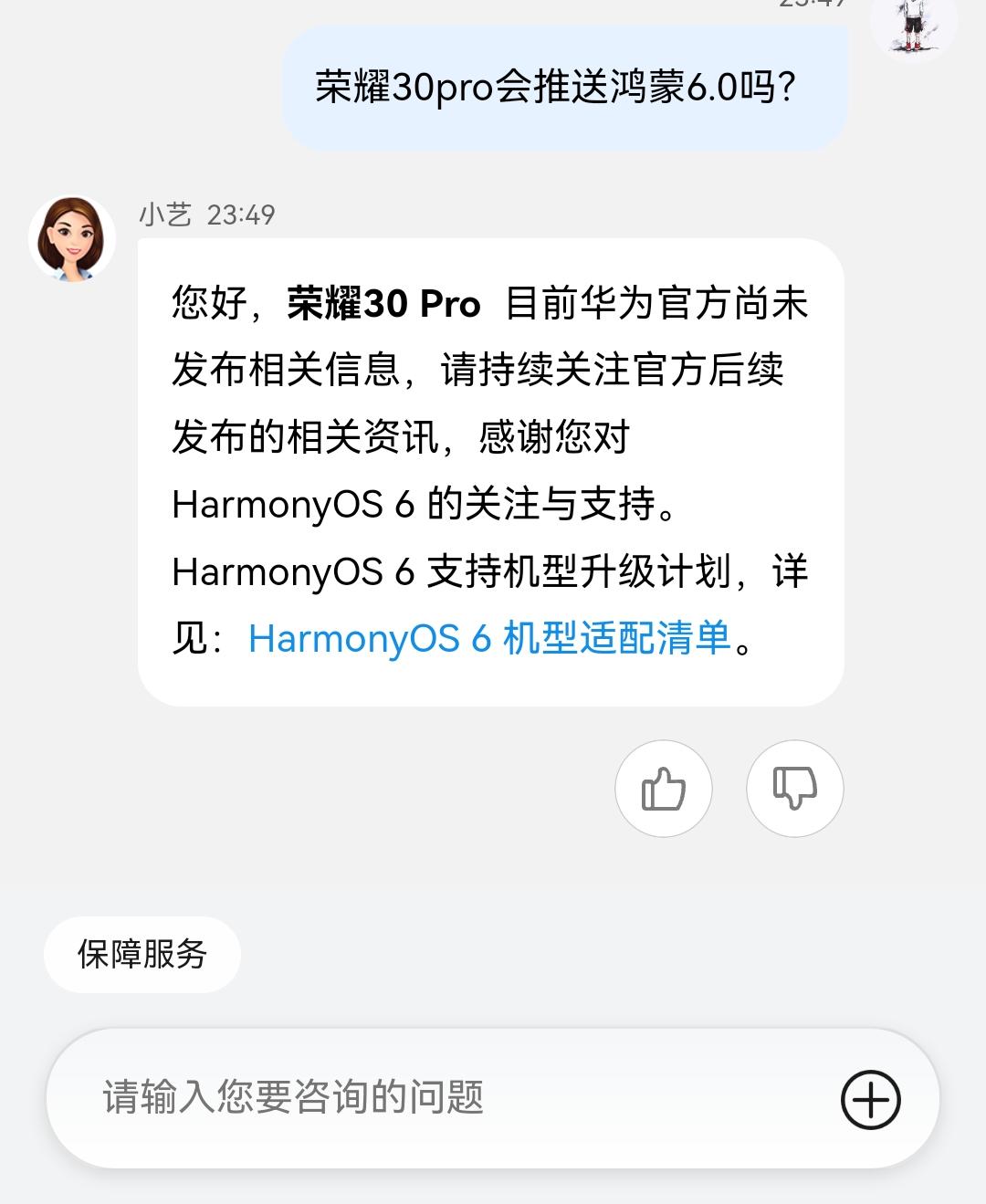 今天在豆包AI问荣耀30pro 会不会适配鸿蒙6.0?豆包说已经开始升级,已全量配送升级,我还以为是真的,打开软件更新并没有,问了华为客服,直接就说荣耀30pro并没有收到相关的升级通知。