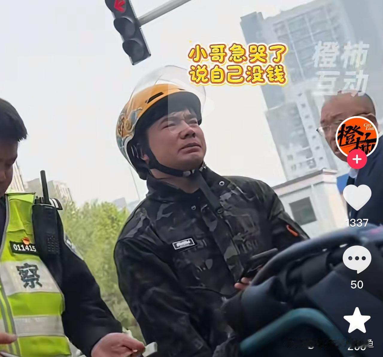 看见这个局面,刚才还强装镇定的外卖小哥,瞬间就绷不住了,急得抹眼泪。
