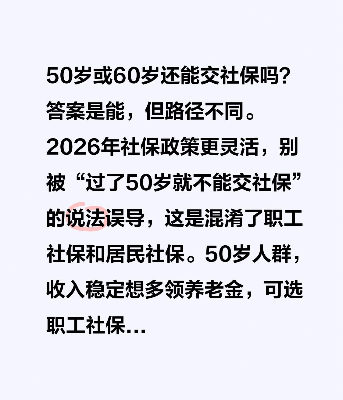 50岁或60岁还能交社保吗?答案是能,但路径不同。2026年社保政策更灵活,别被“过了50岁就不能交社保”的说法误导,这是混淆了职工社保和居民社保。