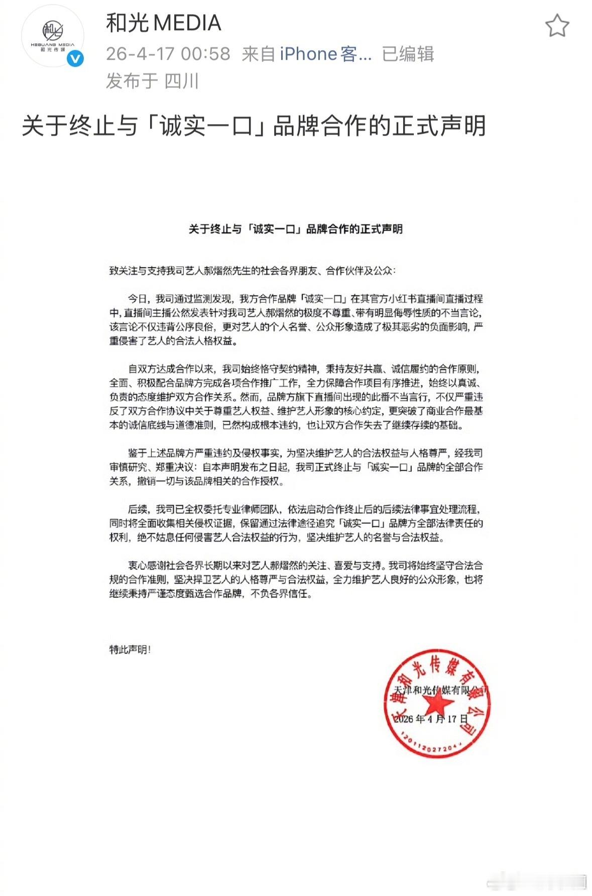 【郝熠然终止代言诚实一口】近日,宠物食品品牌“诚实一口”因合作主播在直播中公开贬低代言人郝熠然引争议,事件发酵后,诚实一口道歉,并宣布开除涉事主播,随后,创始人深夜再次发视频道歉,郝熠然所属的经纪公司宣布终止与诚实一口的合作。事发后,评论区情绪激烈,粉丝普遍拒绝道歉,核心诉求包括解约、赔偿及涉事人员公开露面道歉。据AI统计,65%评论要求终止合作并赔偿,20%质疑处理诚意与时效,15%强调需涉事主播道歉。