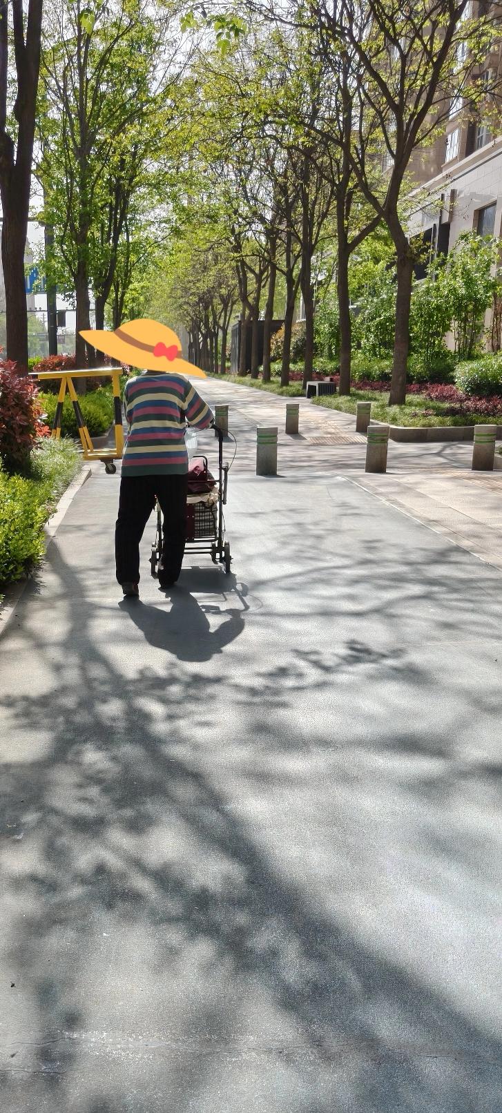 今天出去遛弯,看见前面有位老人正吃力地推着轮椅。我走上前去询问,她告诉我是去修鞋。我问她多大年纪,她说八十多岁了。我便说,为啥不让孩子帮忙去,她回答孩子都忙,没时间。我提醒她,过马路很危险,她却毫不在意,说自己慢慢走就行。我心想,车来车往的,再慢也不安全。于是我提出帮忙,她显得有些难为情,我猜她是怕碰见熟人跟她孩子说,心里有负担,怕孩子责怪她。我看出她的难处,便说:“那你慢慢走,我在旁边看着你过。”