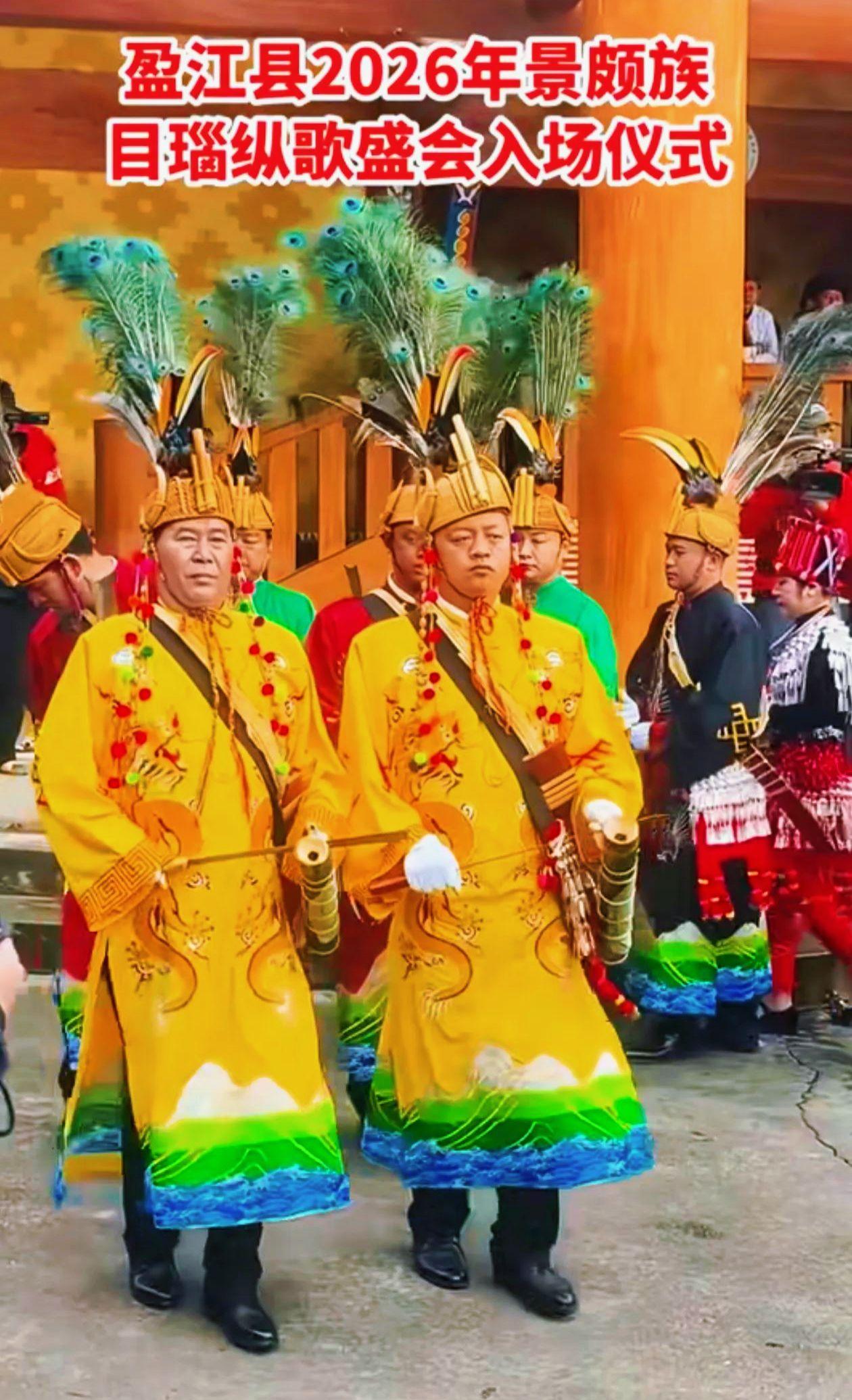 视频里的两位领舞者,是景颇族口中的“瑙双”,是这场万人盛会的灵魂引路人。他们头戴缀满犀鸟羽与彩饰的冠冕,明黄色的长袍上绣着山川纹路,手持长刀,步伐沉稳有力。每一次抬足、每一回转身,都不是随意的舞蹈,而是传承千年的固定套路,是祖先迁徙的足迹、是与天地对话的密码。他们站在队伍最前方,身后是银袍闪烁的舞群、是万千同频的脚步,万千人便如一条奔腾的河流,顺着他们的指引绕柱而行,进退有序、浑然一体。看着他们在镜头里坚定的模样,忽然明白,为何说“没有瑙双,目瑙纵歌便无法开场”——他们不是舞者,而是文化的摆渡人,是把古老文脉稳稳扛在肩上的人,用每一步步履告诉世人:这片土地的根,从未因岁月流转而枯萎。