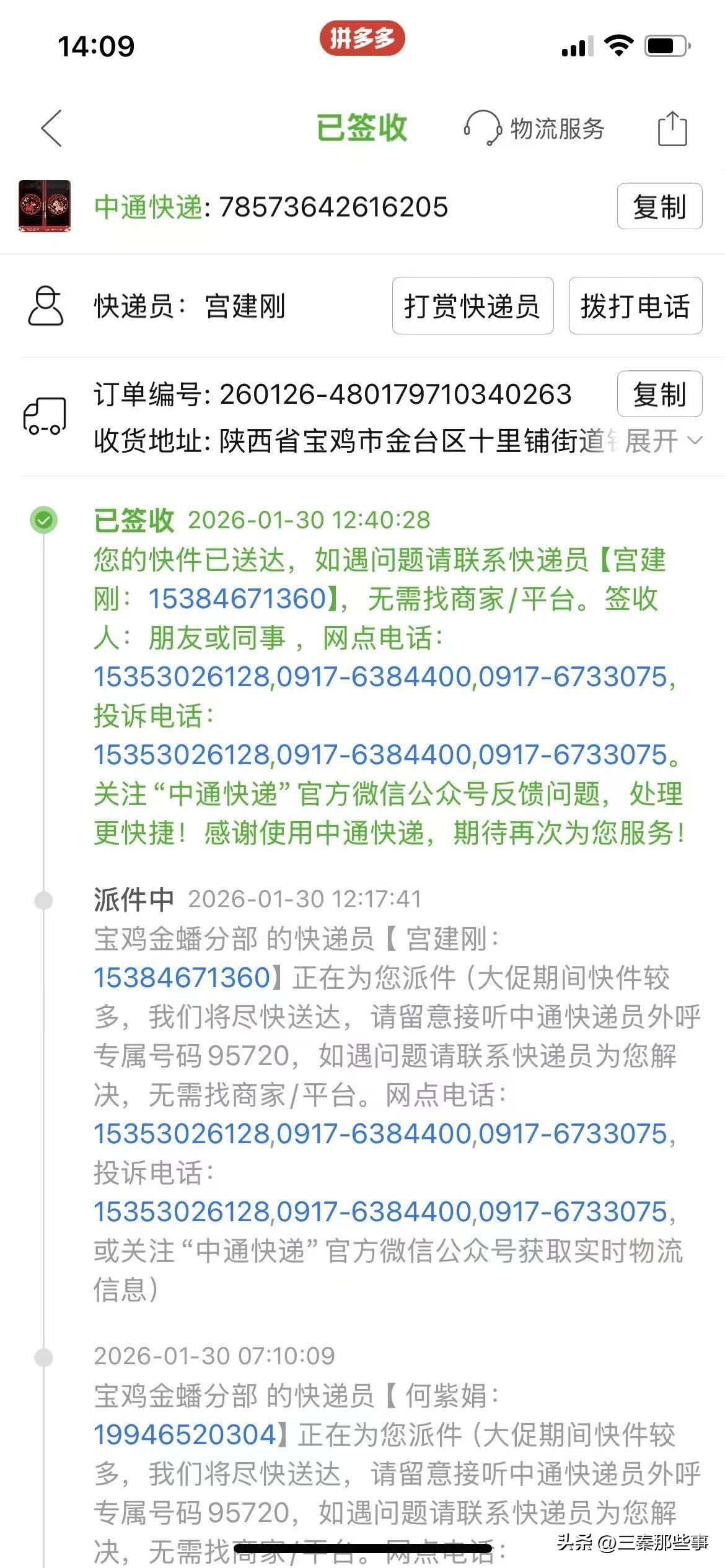 宝鸡网友反映:中通快递不按指定地址派送 用户反映多次仍未解决你好,我是宝鸡市金台