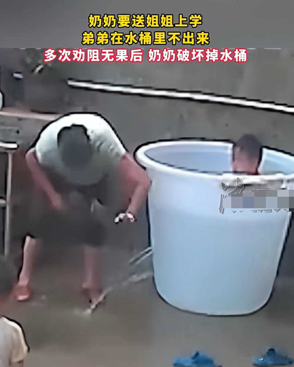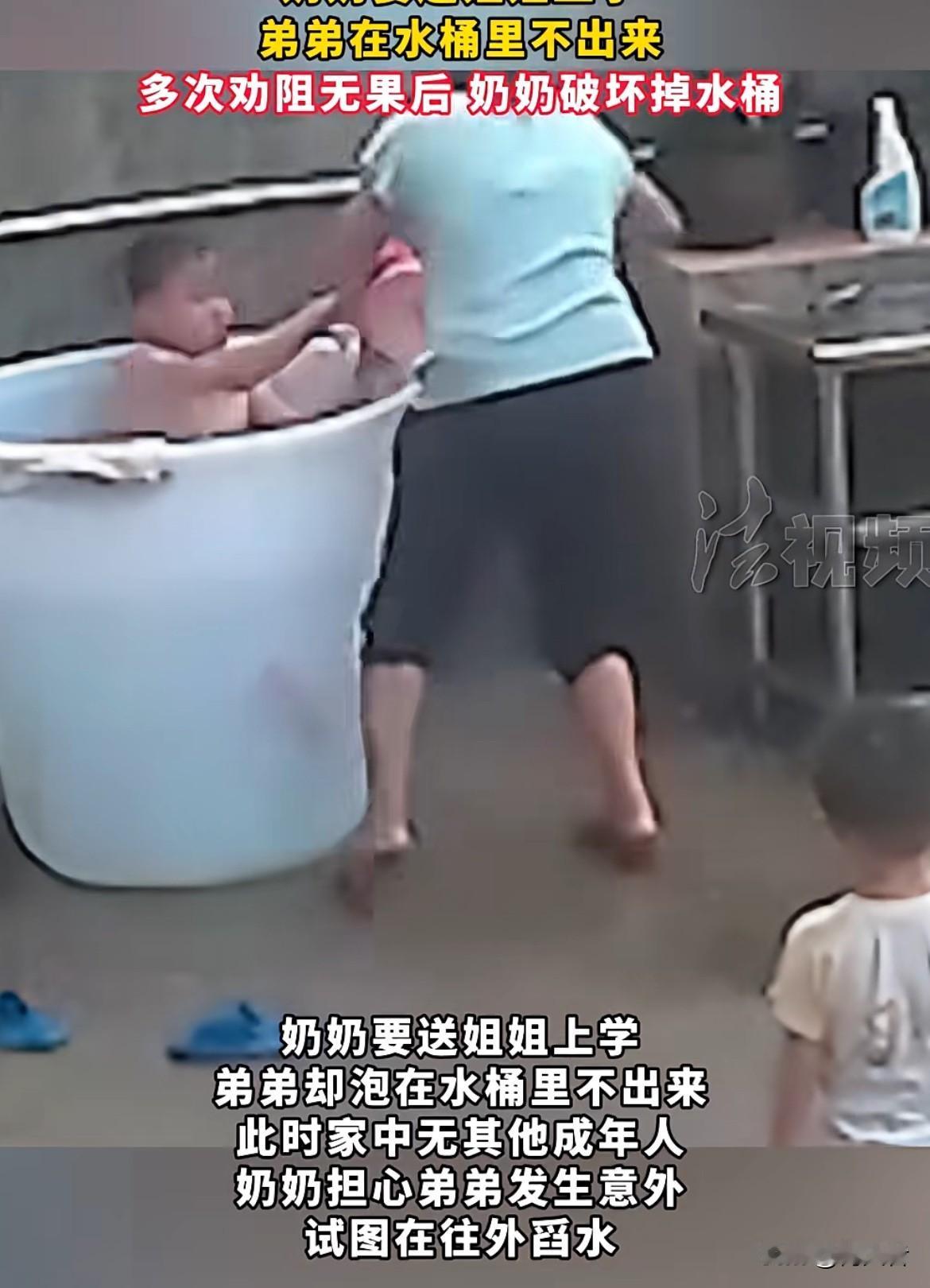 奶奶拿刀砍水桶???原来是奶奶要送姐姐上学,弟弟却泡在水桶里不出来,家里又没其他大人。奶奶心里肯定急坏了,万一弟弟在水桶里出意外可咋办。多次劝阻都没用,奶奶也是没办法了才破坏掉水桶,不过奶奶这应急处理也挺果断的,先保证弟弟安全,再送姐姐上学。