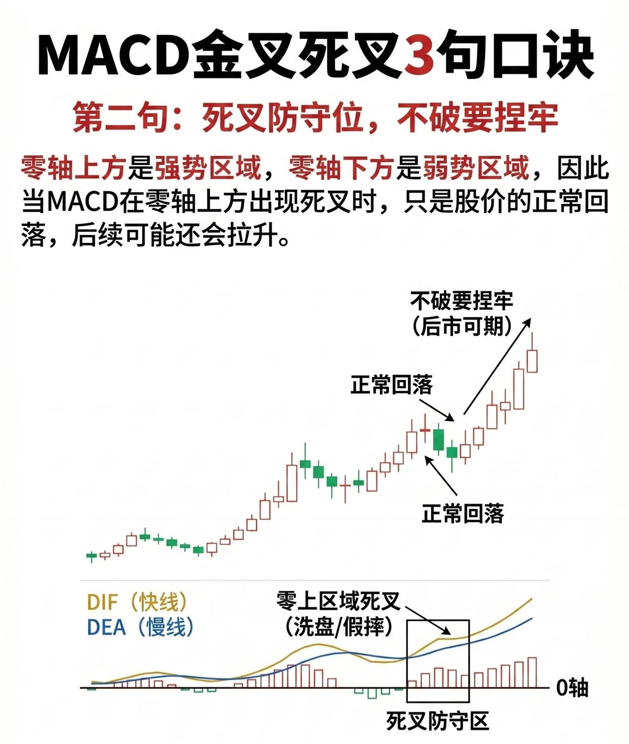 在零轴上方区域,MACD出现死叉(DIF下穿DEA)时,往往只是短期正常回落,而非趋势转折。