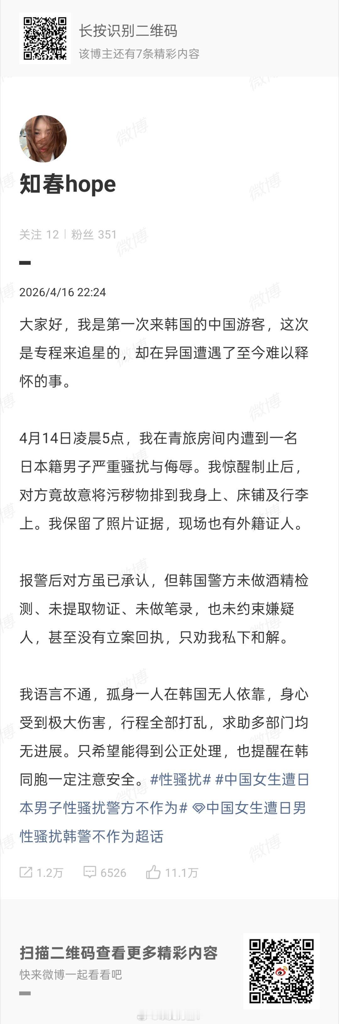 中国女生在韩遭男子性骚扰被劝和解一名中国女生去韩国追星时,在入住的青旅遭遇日本人的恶意性骚扰,还把排泄物弄到女生的衣服床铺上。