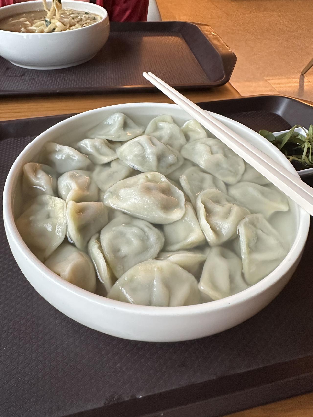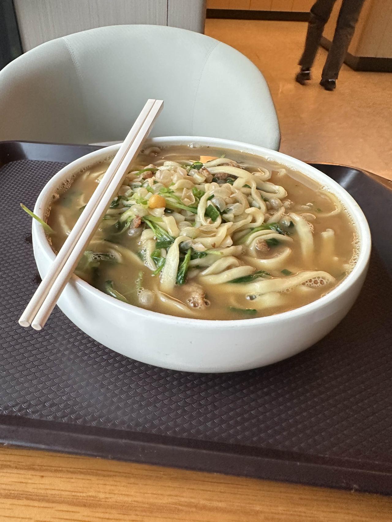 第一次来阜阳才发现这里的面馆、胡辣汤多,与河南的饮食有些类似。昨天我入住的全季酒店免费晚餐供应了面条、水饺,今天的自助早餐有韭菜盒子、煎饼、面条及胡辣汤等好多品种,味道也不错。我们是入乡随俗,我对面食还是习惯的。