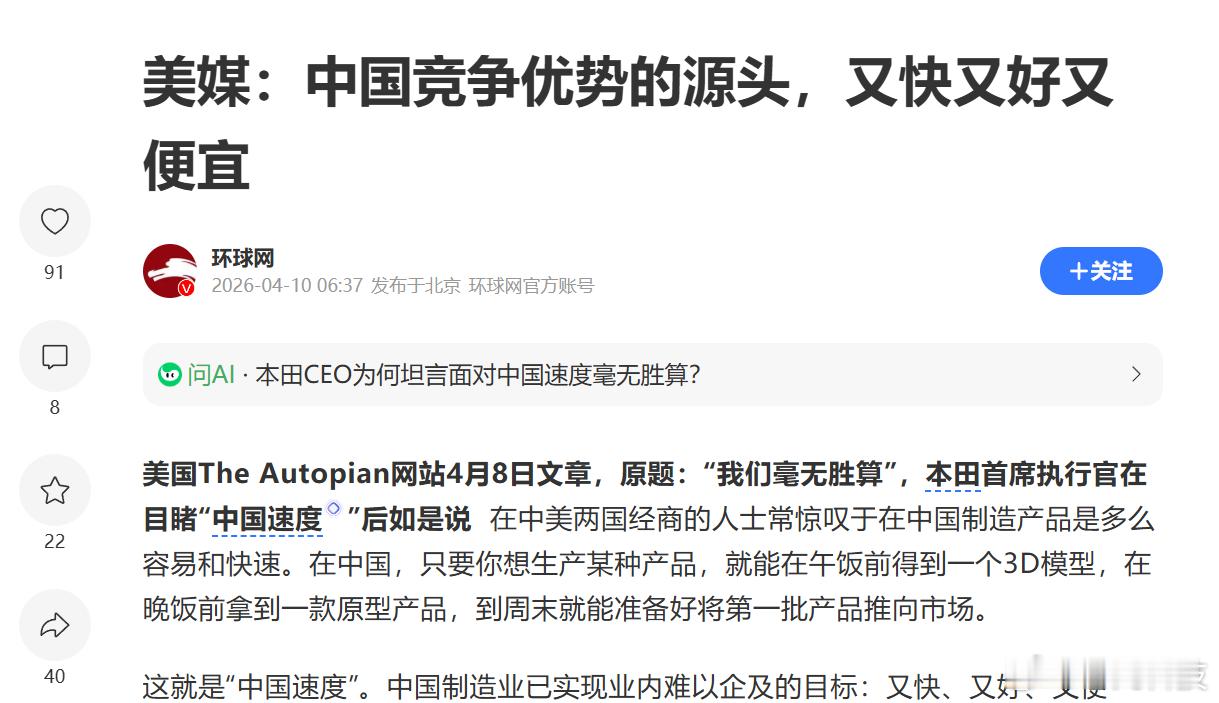 中国工厂这次让全球车企看清了差距,本田CEO直言:我们毫无胜算。 最近本田CEO参观完中国一家汽车零部件供应商工厂后,说出了这样一句话:“面对这样的实力,我们毫无胜算。”这话可不是自谦,工厂从零部件采购到物流管理,全流程自动化,劳动力成本低的同时质量还稳。他看到的,就是美媒所说的“中国速度”——又快、又好、又便宜。 美媒最近专门分析中国制造业的竞争优势,里面举了个例子很典型:去年一辆国产电车在德国高速上出了点小毛病,车里坐的是该品牌的德国负责人。他趁着开会前给杭州的工程师发了邮件,等他开完会出来,软件更新包已经推送到车上,问题解决了。而欧洲车企处理同样的问题,往往需要好几周。 当然,这种速度不是偶然,美媒列了组数据:过去20多年,中国在交通工具技术领域的专利申请量,几乎是德国的5倍。传统车企开发一款新车要五到七年,中国竞争对手两年就能推出来,光效率上就差了一大截。 福特CEO去年也说过,他买了一辆中国电车,爱不释手。日产的设计部门更实在,直接向上海工作室学“中国速度”,结果产品设计时间缩短了30%到40%。以前大家总觉得“又快又好又便宜”不可能三角,如今中国企业硬是给跑通了。 更关键的是什么?这套“又快又好又便宜”的打法,早就不限于汽车了。举个最简单的例子,现在你去电商平台上随便翻翻,国货运动鞋、手机、家电,呼声一个比一个高,原因就是性能不输国外大牌、价格却亲民一大截。 数据也能说明问题,例如春季很多人出游,相比前几年进口服饰是第一选择,如今国产户外品牌在各大平台爆火,仅唯品会上,骆驼、伯希和、凯乐石等很受欢迎。国产服饰本来就不贵,如今叠加平台折扣,成为越来越多人的主流选择。 所以说,中国制造如今已经跑出了自己的节奏,不管是汽车还是日常用品,国货都越来越能打。也就能理解,为什么法媒曾说“中国品牌正越来越时尚”了,毕竟国货不仅有实实在在的硬实力,更重新定义了潮流标准,华流正在成为顶流。牛丸科技说