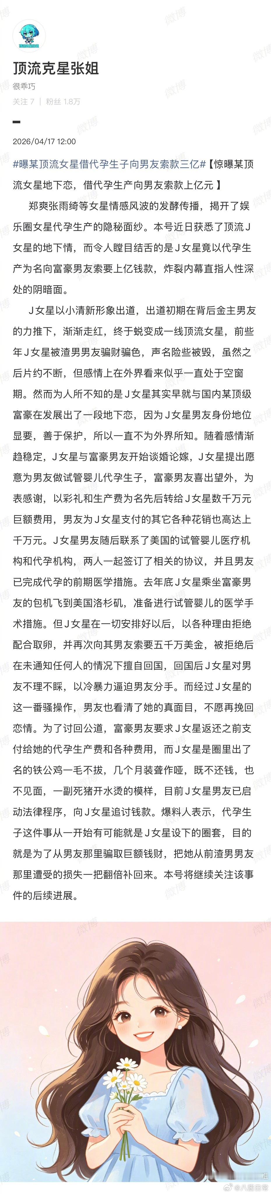 曝顶流女星借代孕生子向男友索要3亿这还真是不便宜!