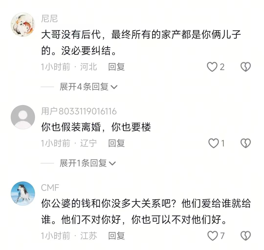 总之,我想说的是,不管什么时候,先顾好自己的小家再谈帮别人。房产证上没你的名字,就别随便掏大额积蓄,懂吗?你以为你在为家庭付出,别人可能只把你当外人。随便别人怎么说,自己的钱袋子捂紧了才是硬道理。你们要是遇到这种偏心的公婆,会怎么做?
