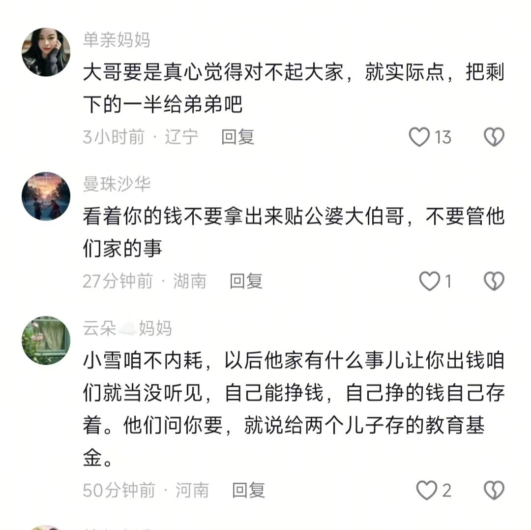 本来以为小雪会趁机闹一场,结果她居然说放下了。嗯,怎么说呢,可能是真的寒心透了吧。她说婆婆已经把当初她出的买房钱转回来了,以后再帮忙,只会签借条借钱给大伯哥,绝对不直接给婆婆。这点我觉得太给力了!当然啦,也有人说她前后说法不一样是博流量,胡扯!谁愿意把自己家这么难堪的事摊在全网面前啊?可能是吧,她只是想找个地方发泄一下而已。