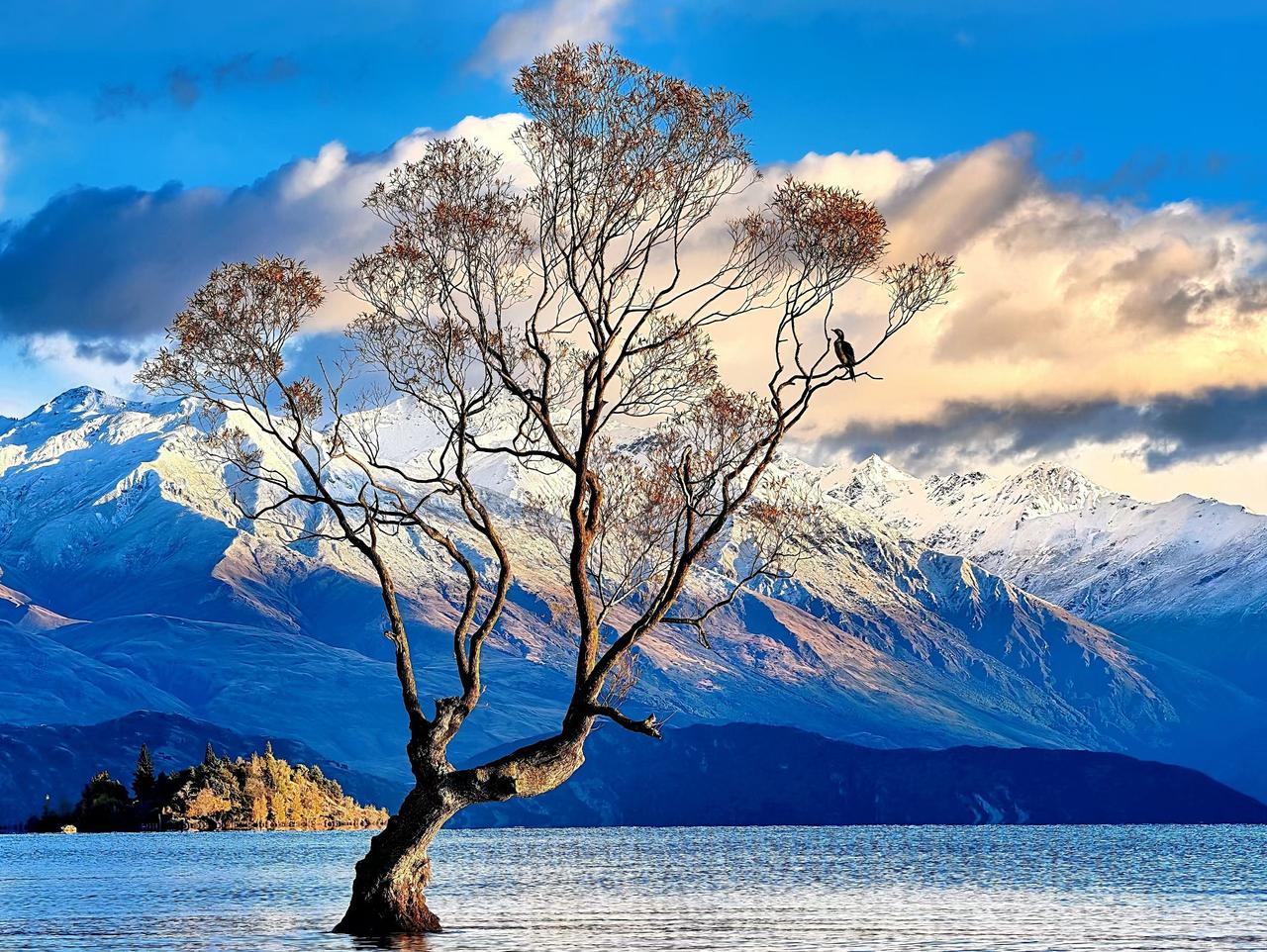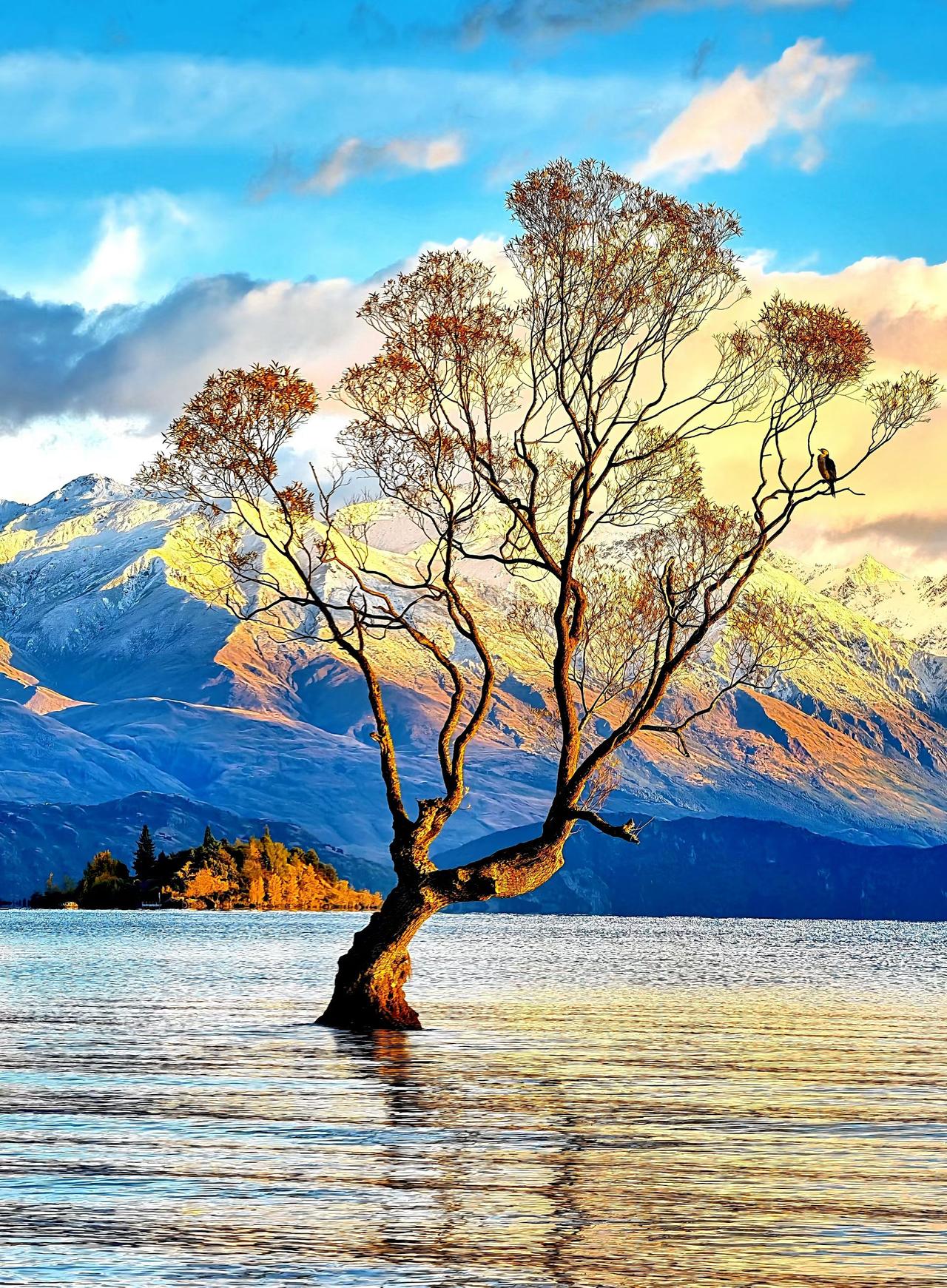 新西兰,瓦纳卡湖,孤独的树(1930年代插柳入湖,做为围栏,后成长为孤独的树,2014年新西兰摄影师拍摄该树获大奖,该树暴红,成的全球摄影圣地),不孤独……