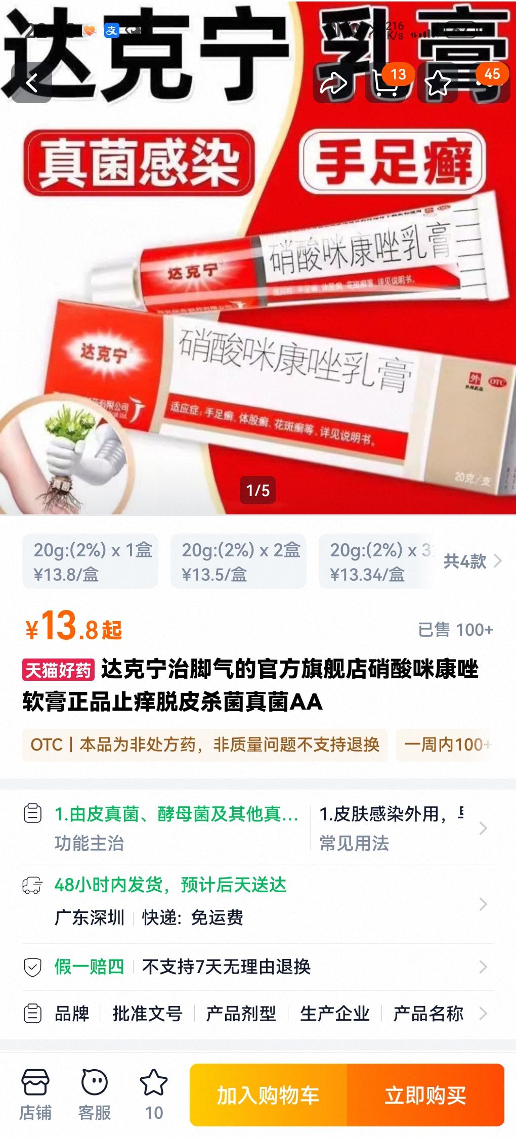 前几天脚趾头间起了水泡,自我判断是真菌感染,由于下班时间太晚,药店都关门了,于是习惯性在某宝搜索达克宁,太便宜的没有买,看到深圳发货的一个卖家报价13.8元,认为比较靠谱,连评论也没看就直接下单了。两天后收到货了居然不是强生医药的达克宁药膏,而是安徽一家名不见经传的小公司产品。