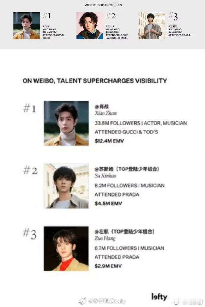 据国际权威机构Lefty,全时装周EMV TOP3是肖战、王一博、苏新皓。 米兰