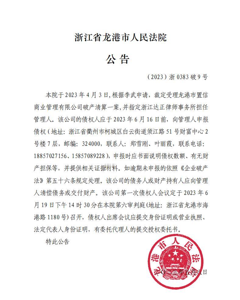 公告内写明,根据债权人李武申请,龙港市人民法院于2023年4月3日作出破产申请民事裁定书,裁定受理李武对龙港市置信商业管理有限公司的破产清算申请。