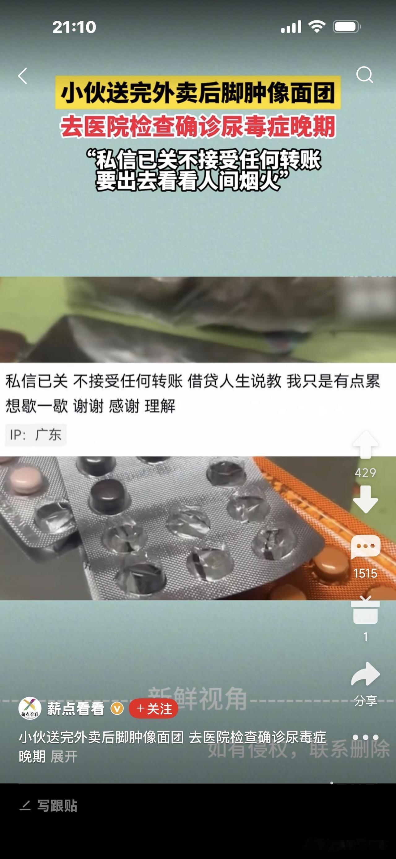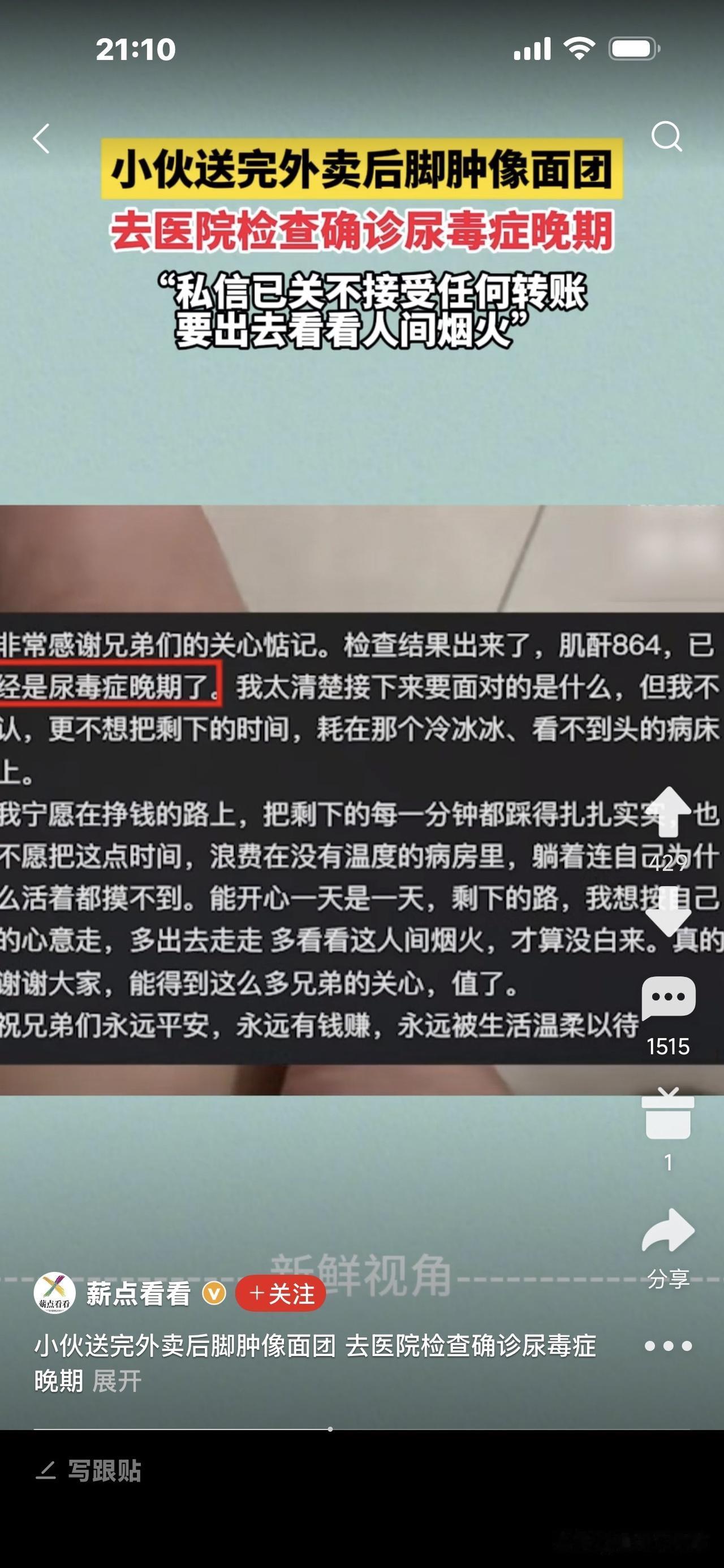 小伙送完外卖,发现脚肿得像馒头, 按下去一个凹洞,被确诊尿毒症晚期。 他竟然不治