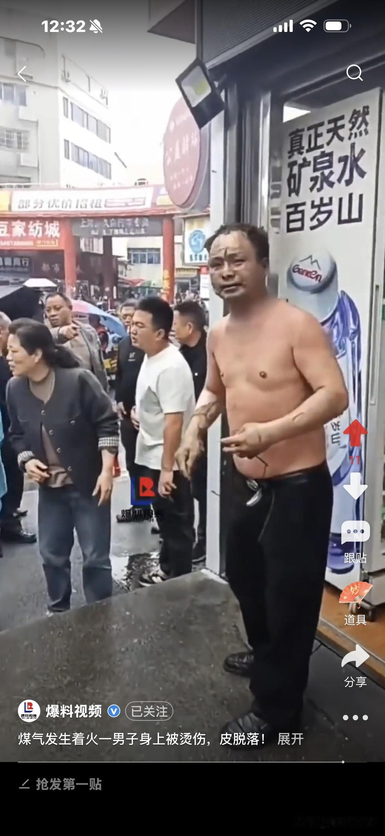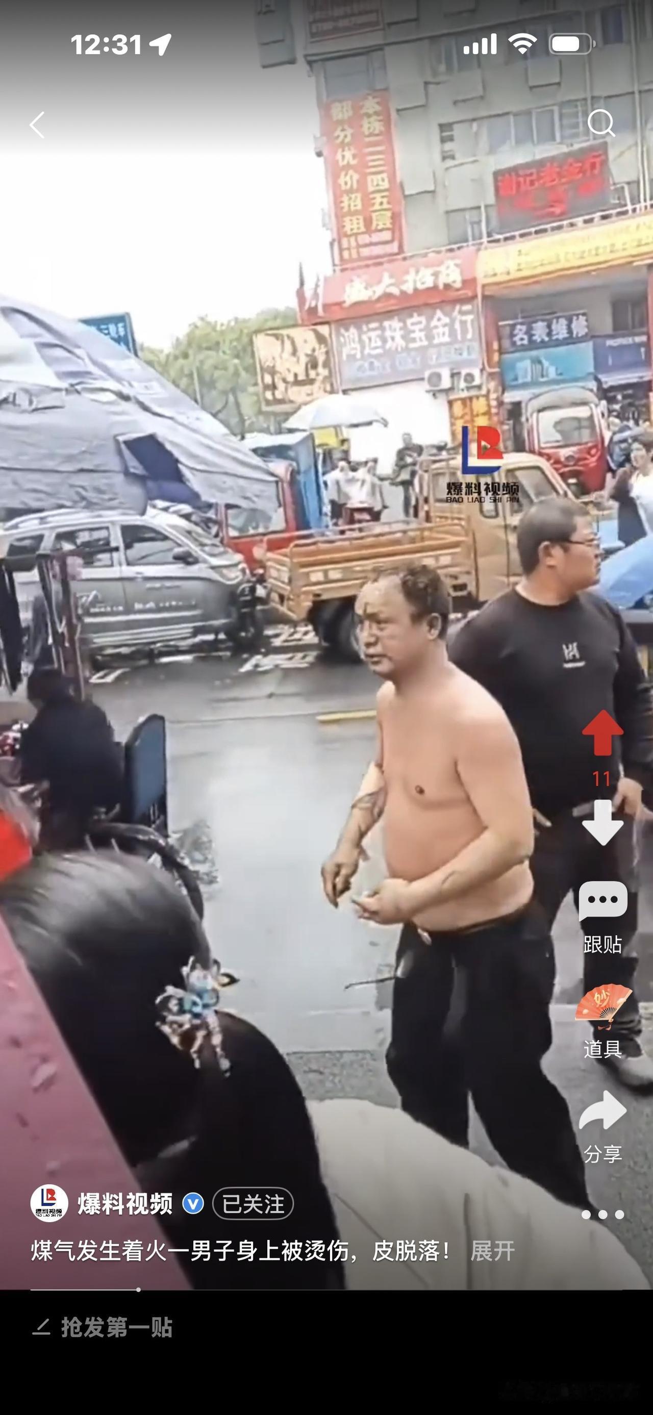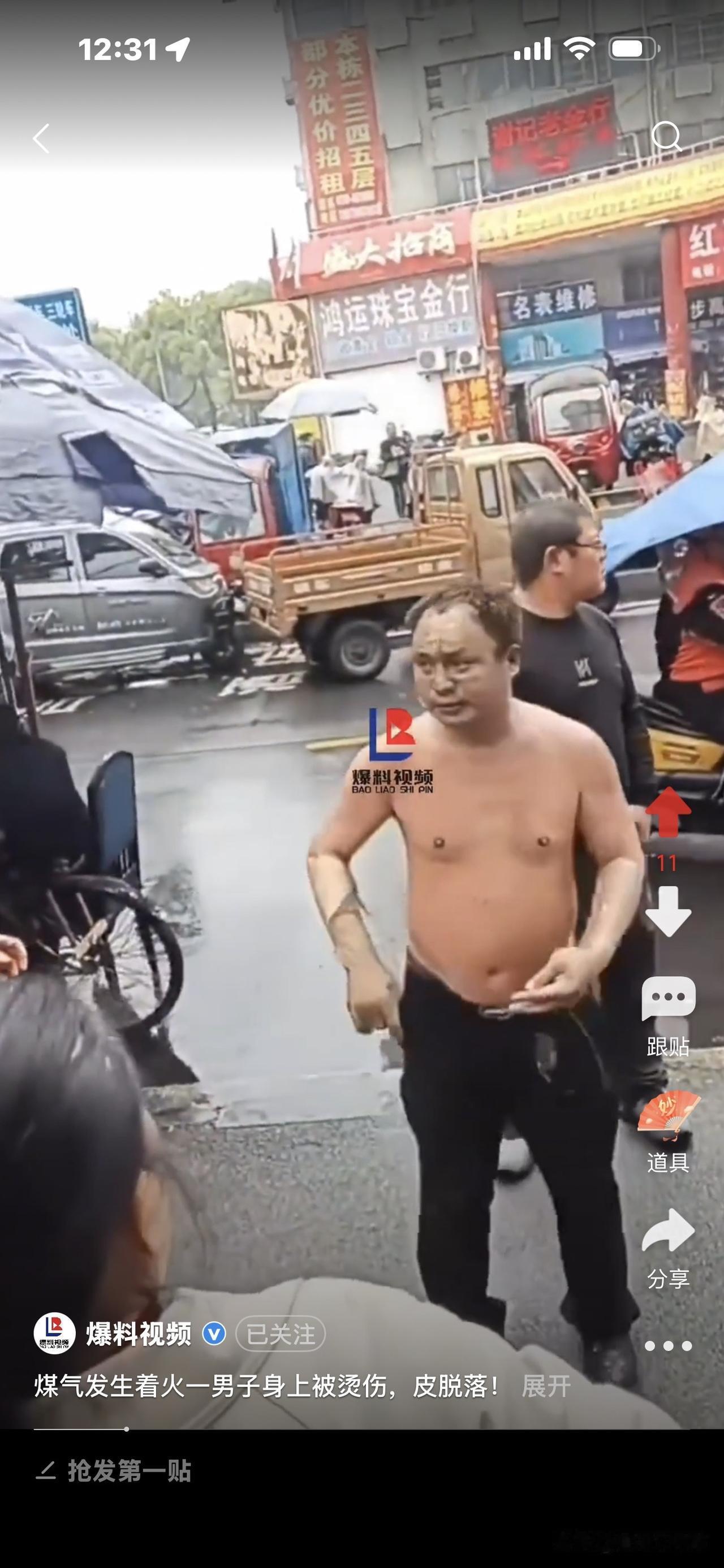 好惨!煤气着火,男子烧伤, 身上皮肤大片掉落! 他跑到街上转圈圈,完全懵了,不知