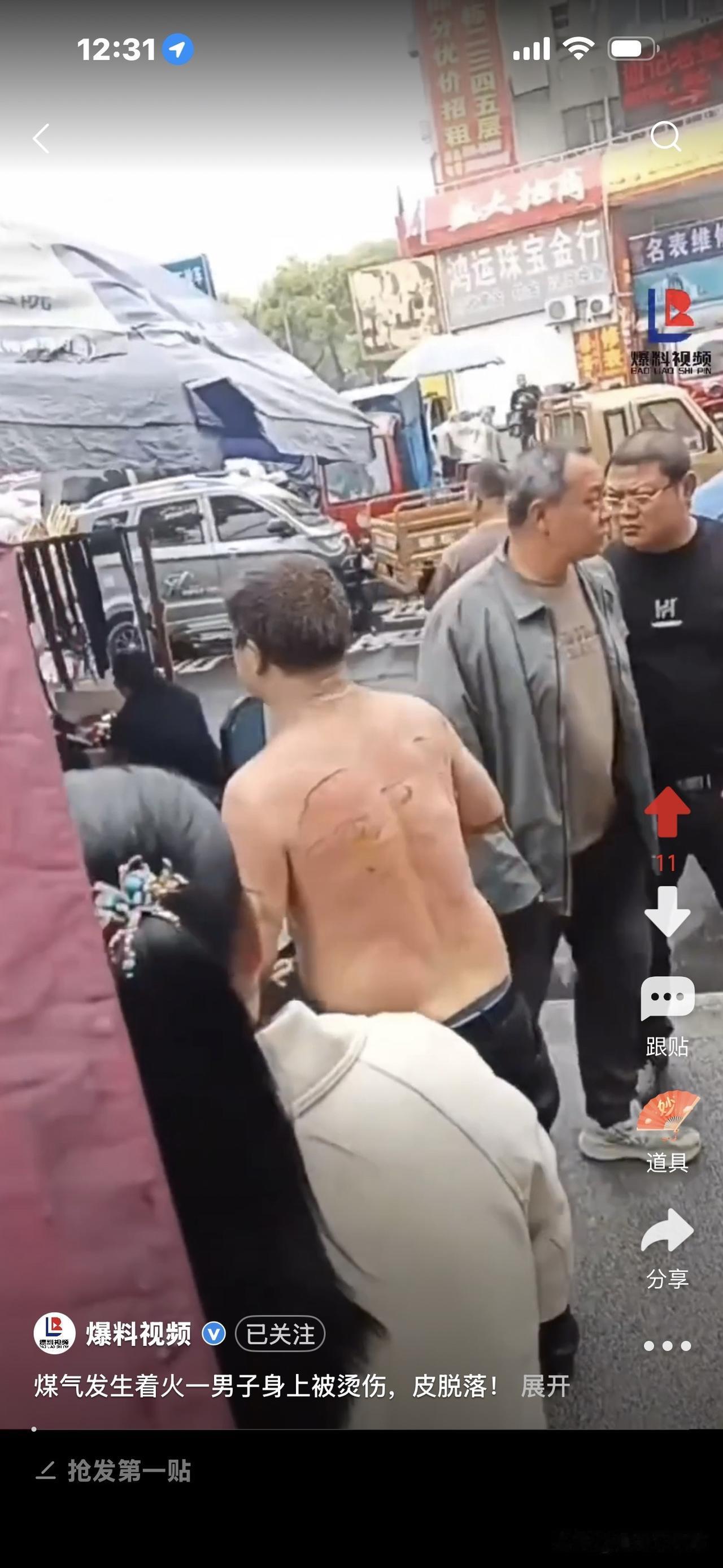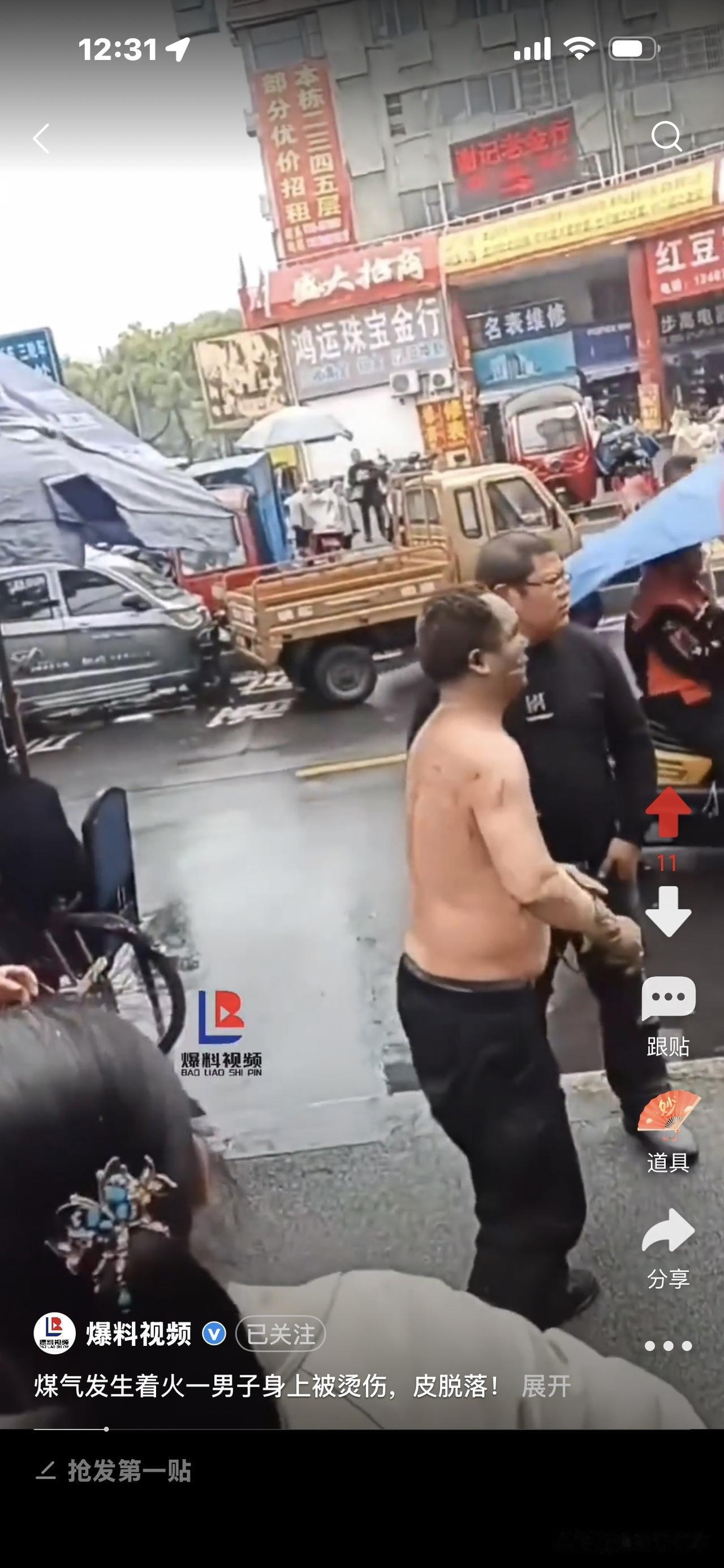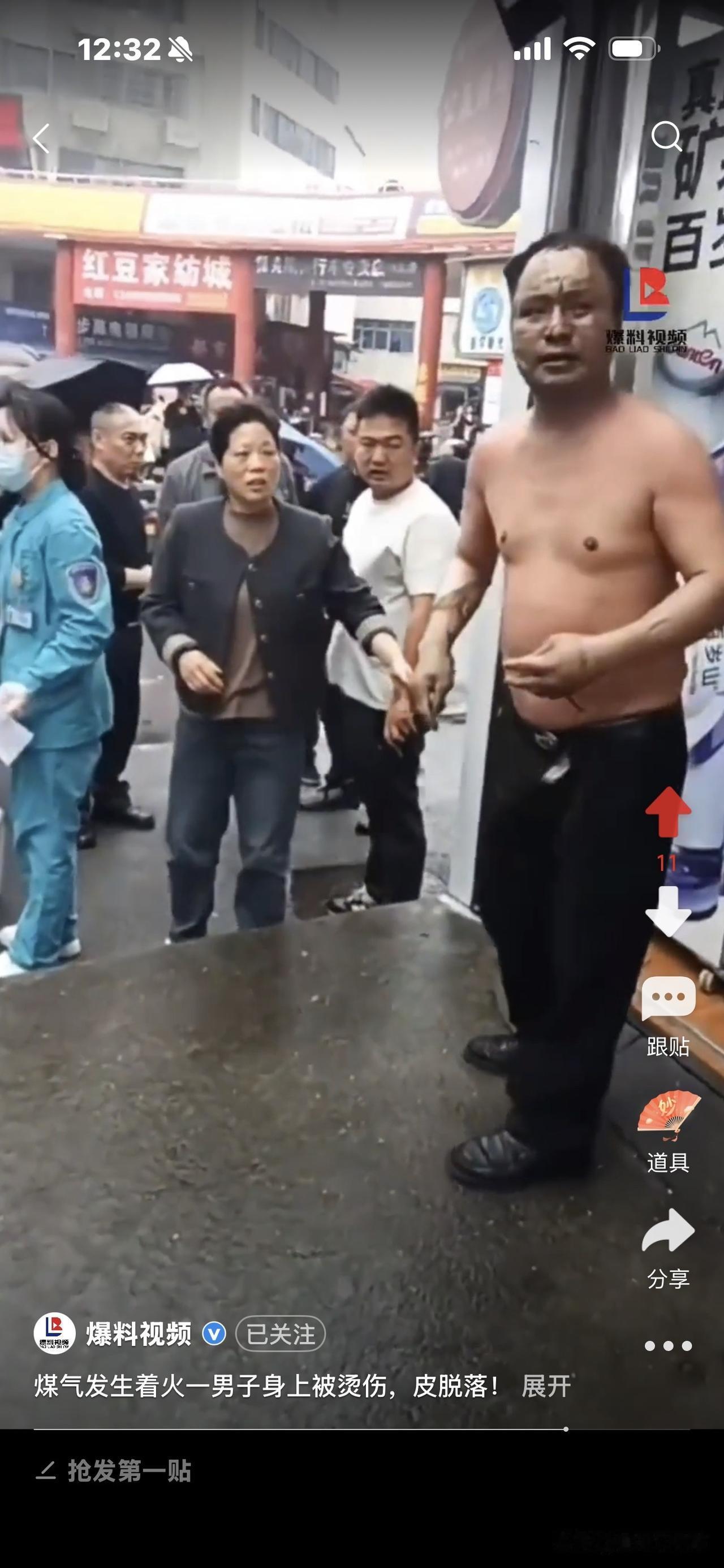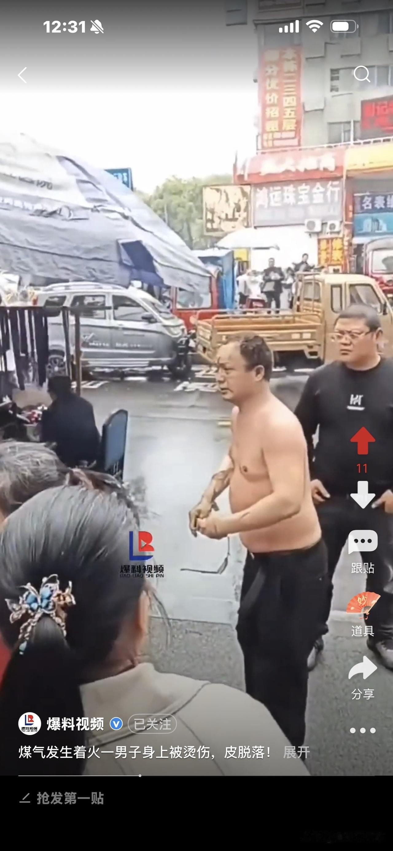 好惨!煤气着火,男子烧伤, 身上皮肤大片掉落! 他跑到街上转圈圈,完全懵了,不知