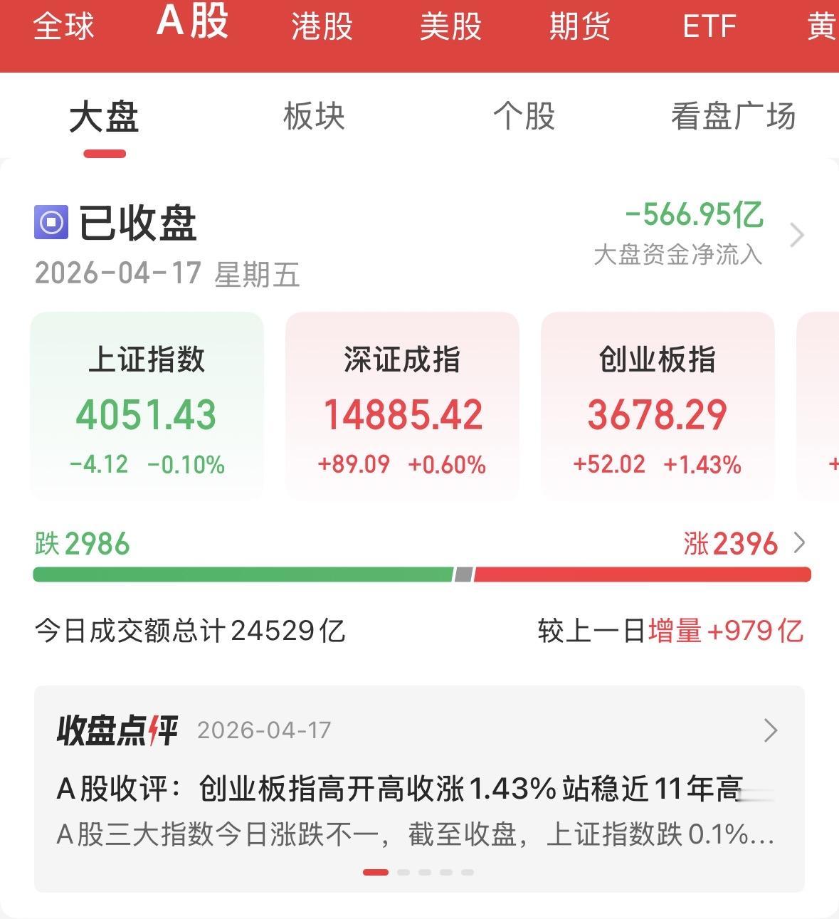 市场呈现典型的“沪弱深强”格局。上证指数微跌0.10%,失守4050点整数关口;创业板指表现强势,大涨1.43%并站稳近11年高点。