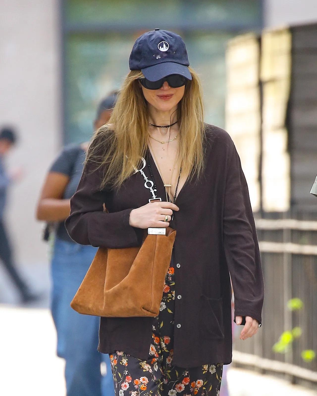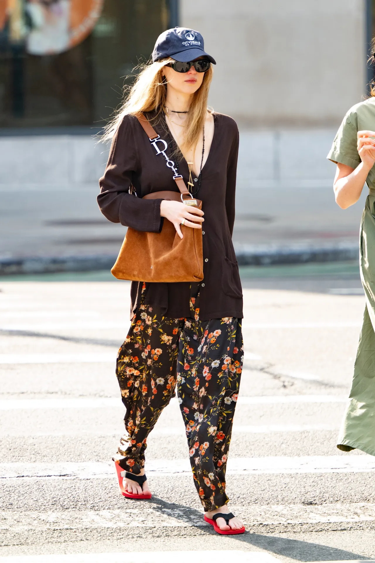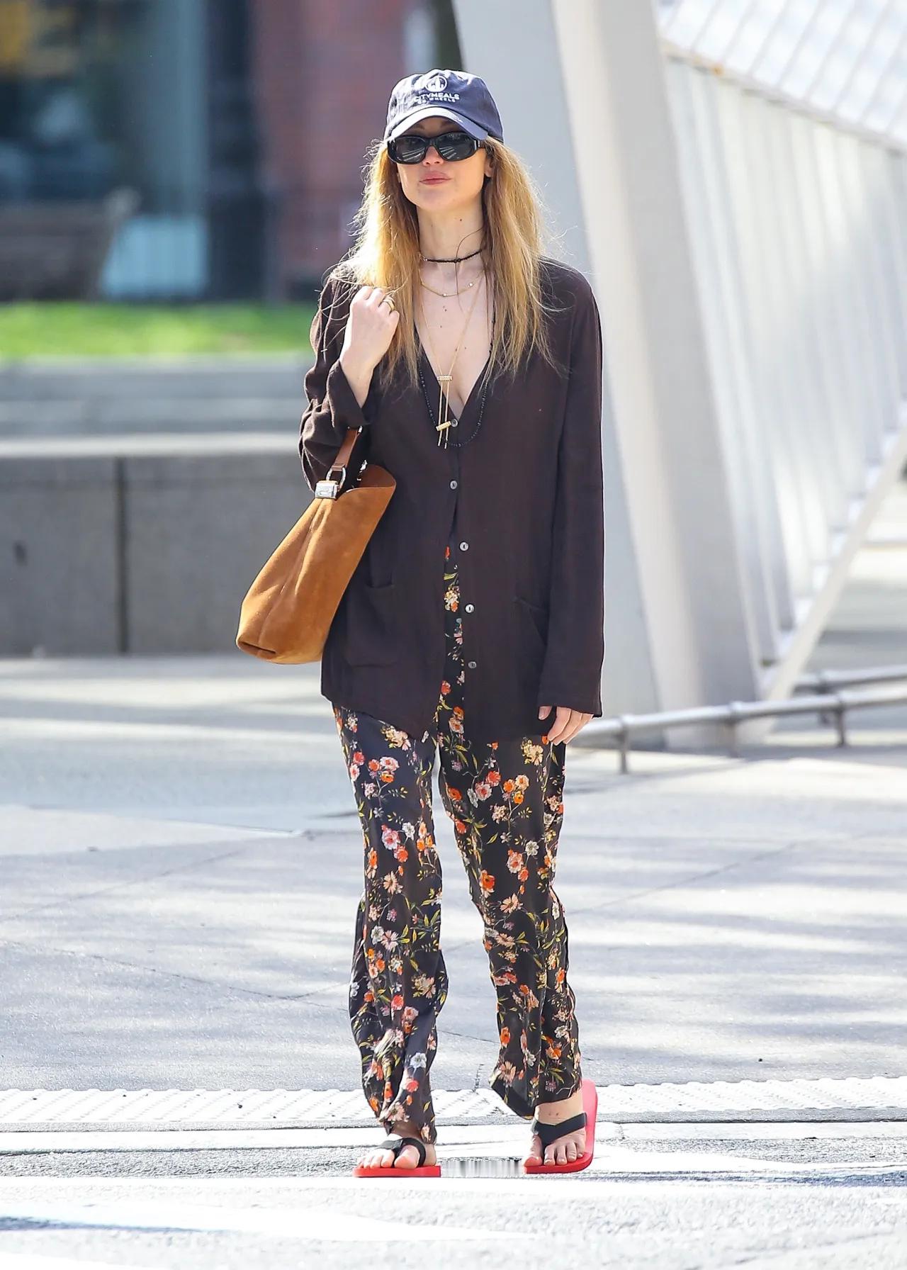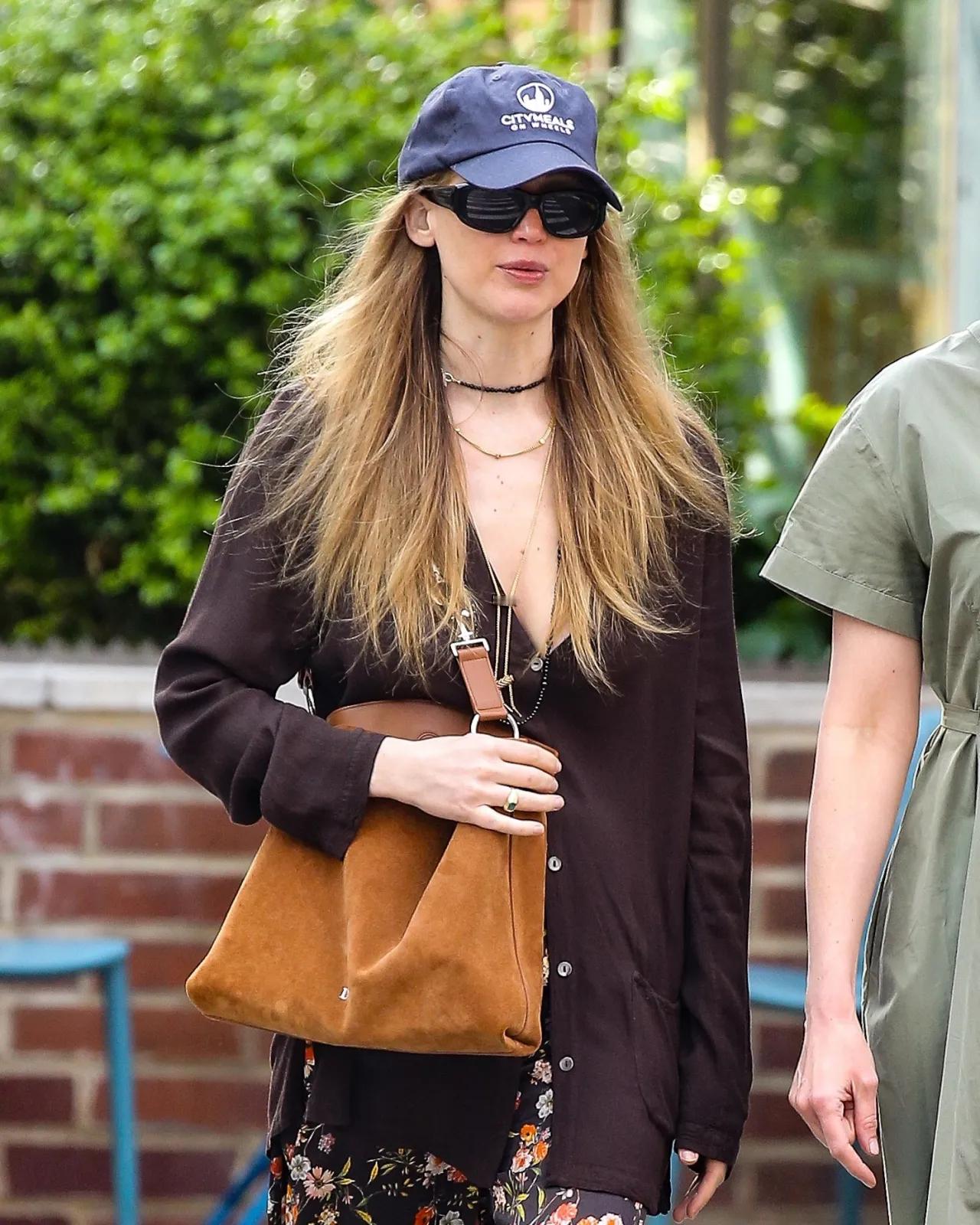 大表姐Jennifer Lawrence 近日纽约街拍,身穿着一件深棕色的长款前襟纽扣衬衫,领口呈深 V 形,宽松长裤上印有花朵图案,肩上挎着的迪奥包。整体轮廓轻松随意,近乎睡衣风,但比例拿捏得恰到好处,显得很有心机。明星街拍