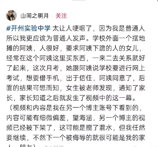 我看整个事件,最冤的,最的受委屈的还是发声的这个学生,为了正义把整个事件发出来,却背了个处分。关键在于,下跪阿姨本人性子软,为生活所迫,她自己不想追究,导致发声的学生所做的事情,对于校方,甚至下跪阿姨来说,都是在多管闲事,校方可以说他在扩大矛盾,会说“人家阿姨都不追究了,你在浇什么油”阿姨会觉得,我不想把事情闹大的,现在我下跪的样子更多人看到了,丢人,也怕影响以后生意。正义学生被夹在中间了!有种被抽空的无力感……