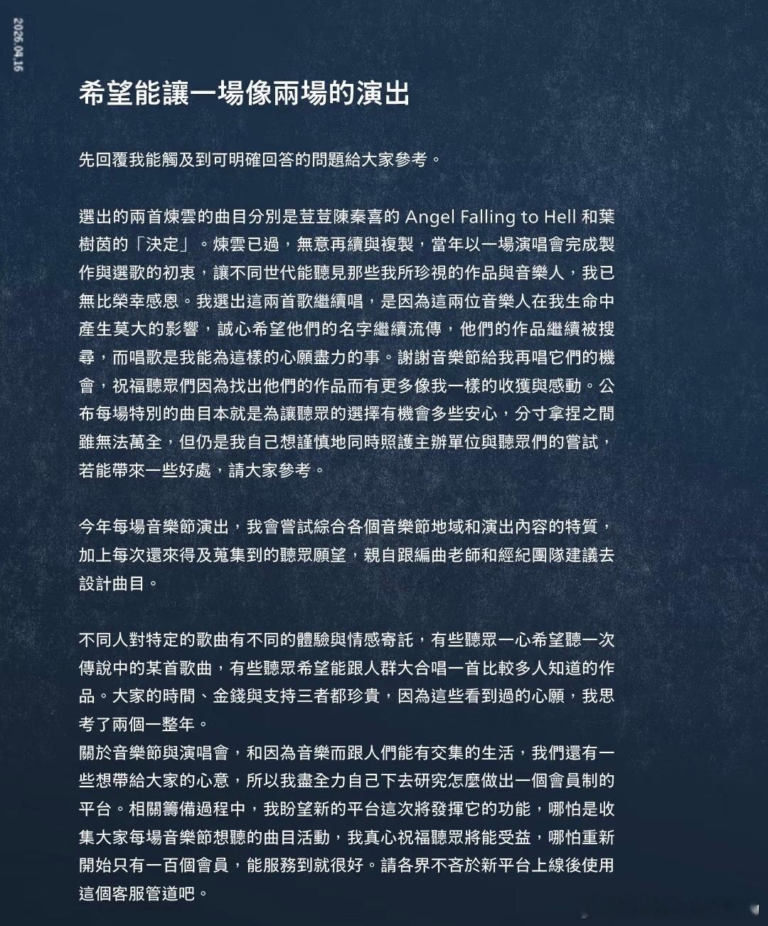 并表示公布每场特别选曲式为了让听众的选择有机会多些安心,分寸拿捏无法完全,仍是自己想谨慎地同时照顾主办与听众们的尝试