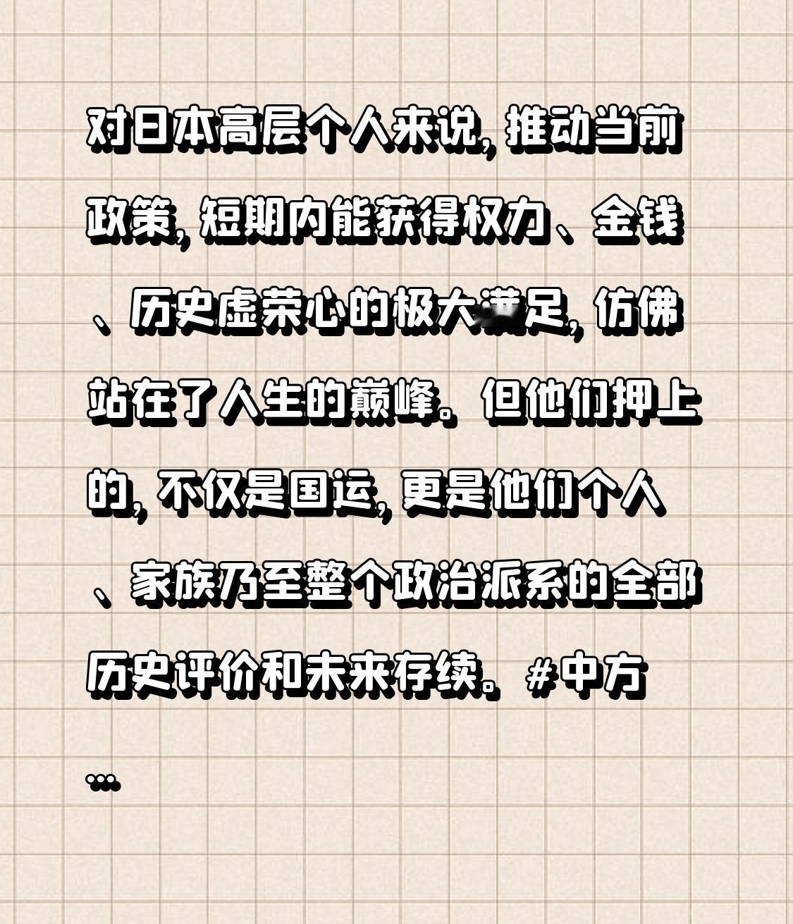 对日本高层个人来说,推动当前政策,短期内能获得权力、金钱、历史虚荣心的极大满足,仿佛站在了人生的巅峰。但他们押上的,不仅是国运,更是他们个人、家族乃至整个政治派系的全部历史评价和未来存续。