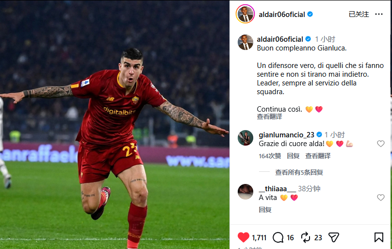 阿尔代尔也发文为他庆生:“生日快乐,詹卢卡。一位真正的后卫,是那种充满存在感、永不退缩的人,也是始终为球队服务的领袖,请继续保持下去。💛❤️”