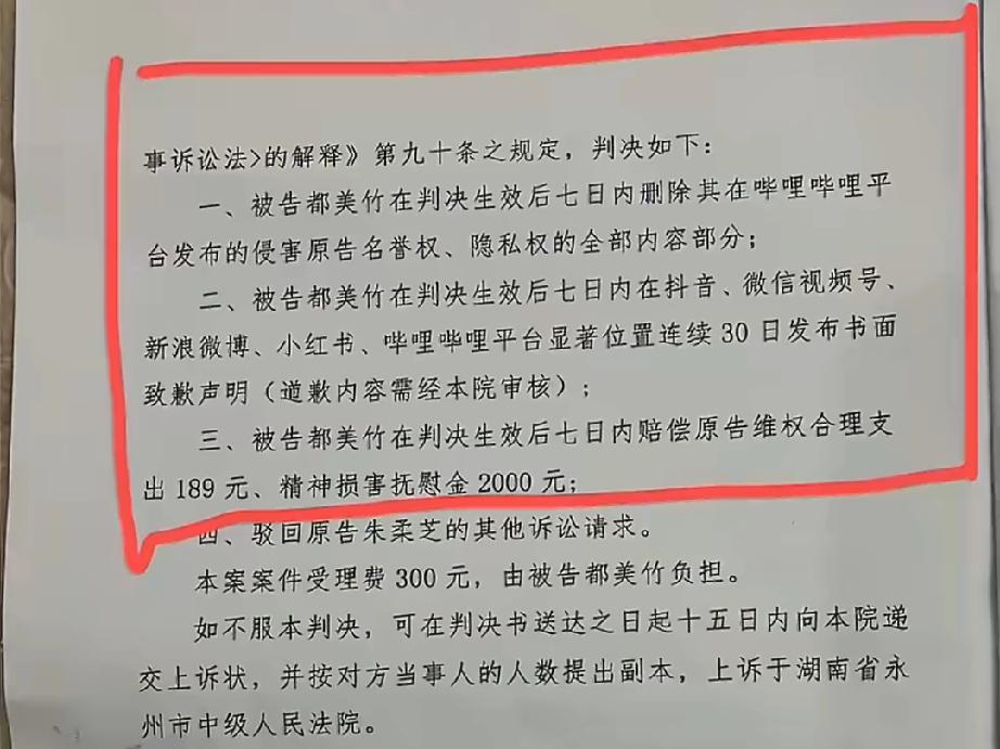 法院最终判了!认定都美竹侵犯名誉权和隐私权,要求她在5大平台道歉30天,赔偿2489元。可判决下来后,她拒不执行,直到现在被法院立案强制执行。