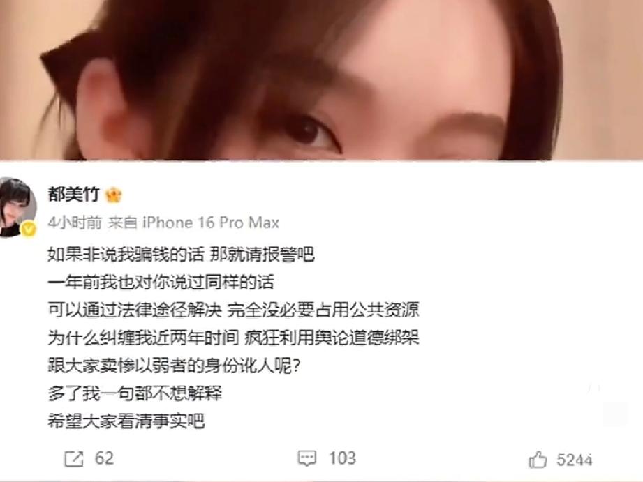 事情起因是几年前,一位单亲妈妈朱女士自称被她“卖惨”诱导,前后转了近20万给她,后来只收回3万。朱女士讨说法,都美竹反而发微博骂她“骗贷炒股”“敲诈”,还曝光了她的个人信息,导致朱女士被网暴、患上焦虑抑郁以及睡眠障碍。