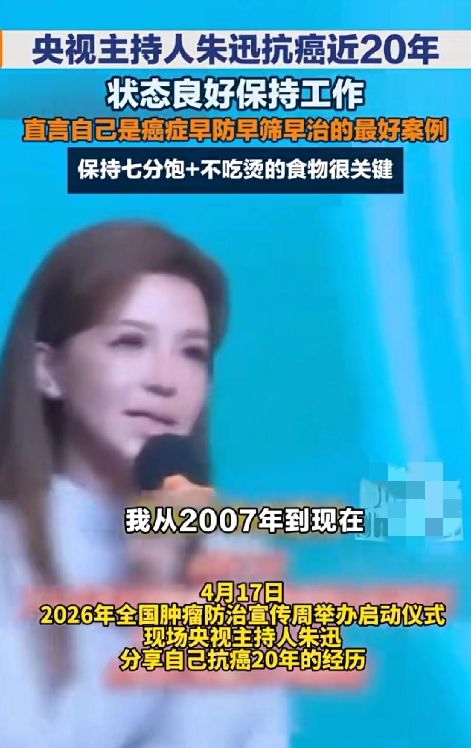 4月17日,2026全国肿瘤防治宣传周启动。央视朱迅现身现场,亲口分享自己抗癌20年亲身经历。