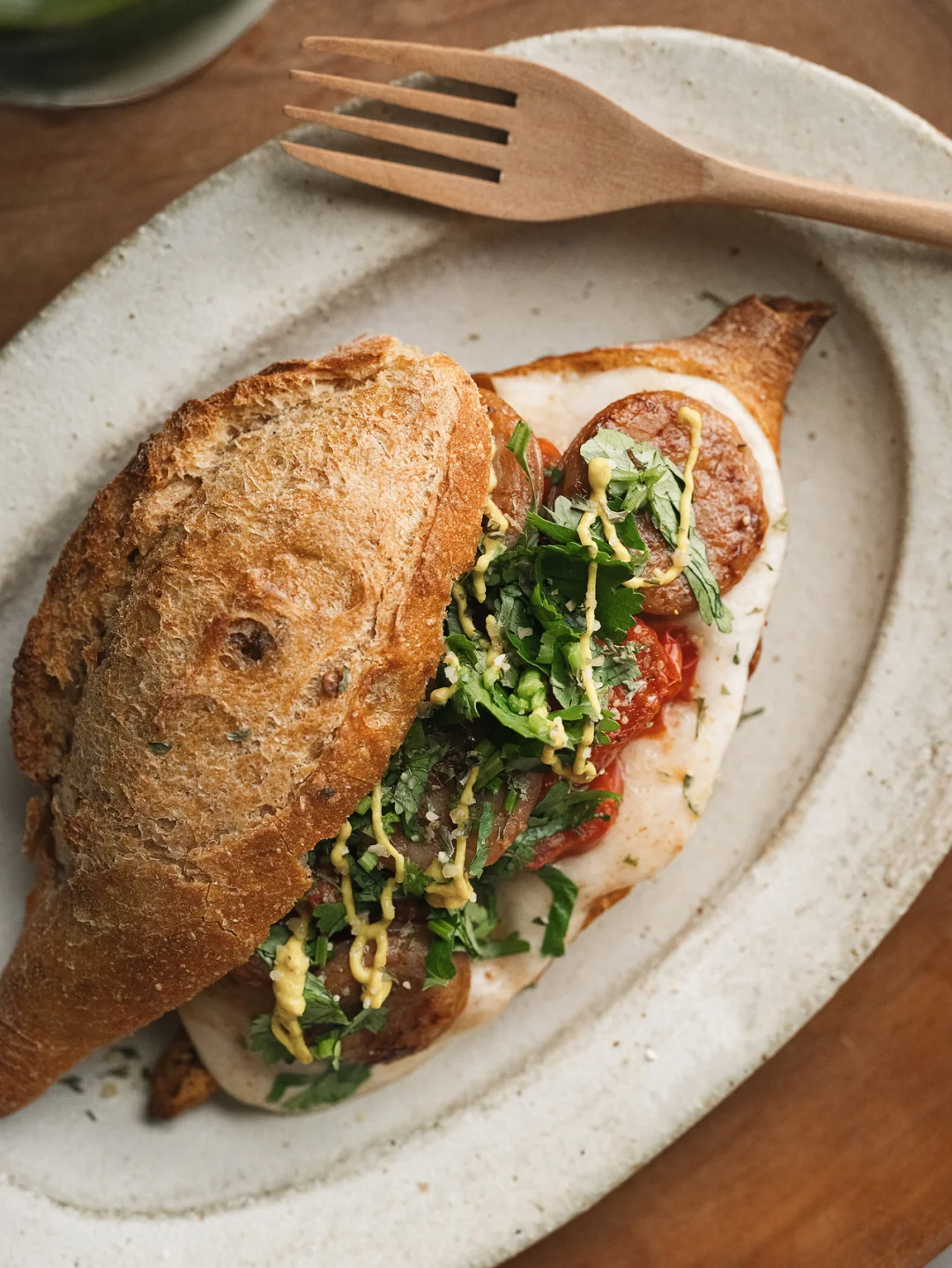 ❷放上烤番茄和香肠,加黄芥末酱和香菜碎