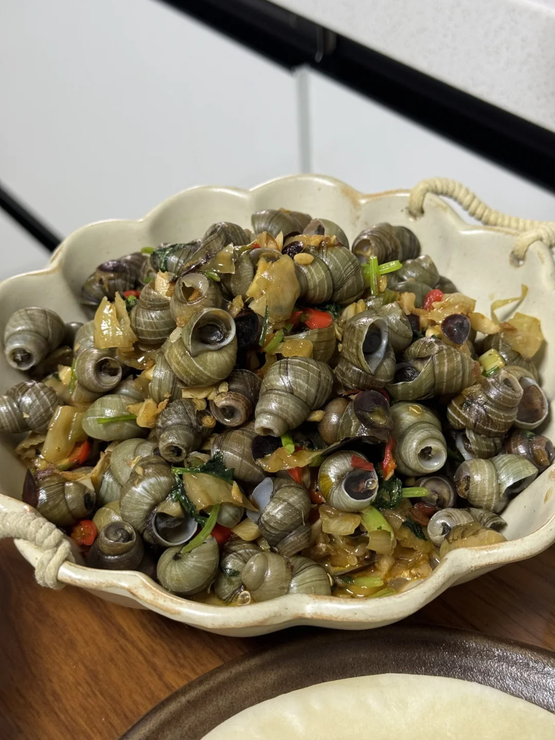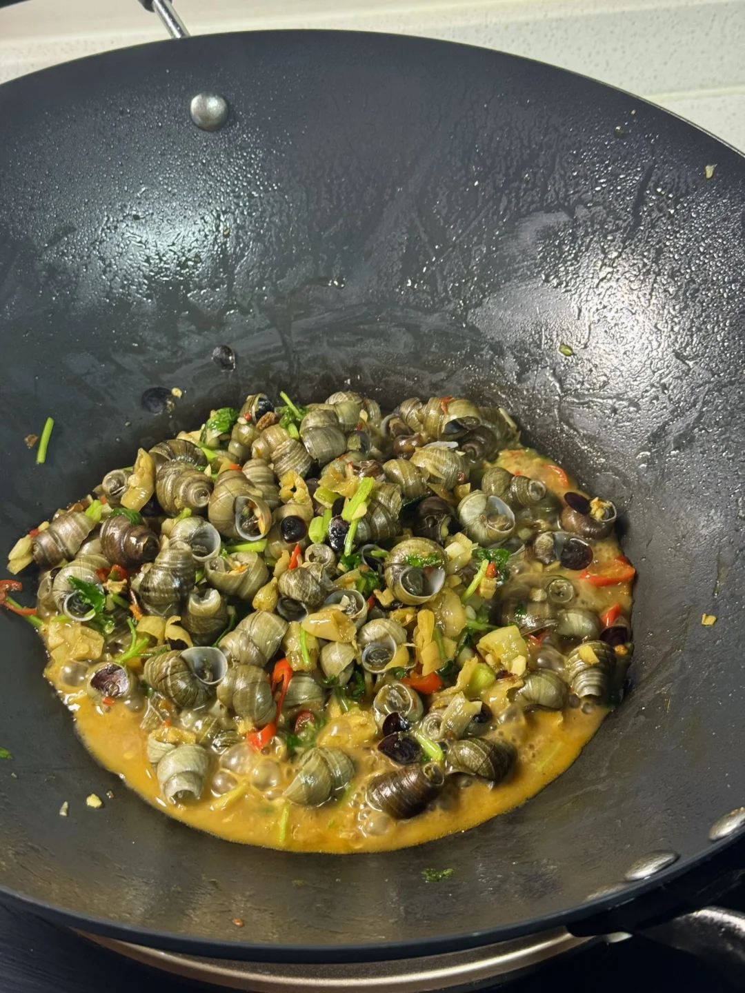 5. 沥干水的螺丝放进去快速翻炒匀加入三勺料酒,这是螺丝容易吸出来的关键哦