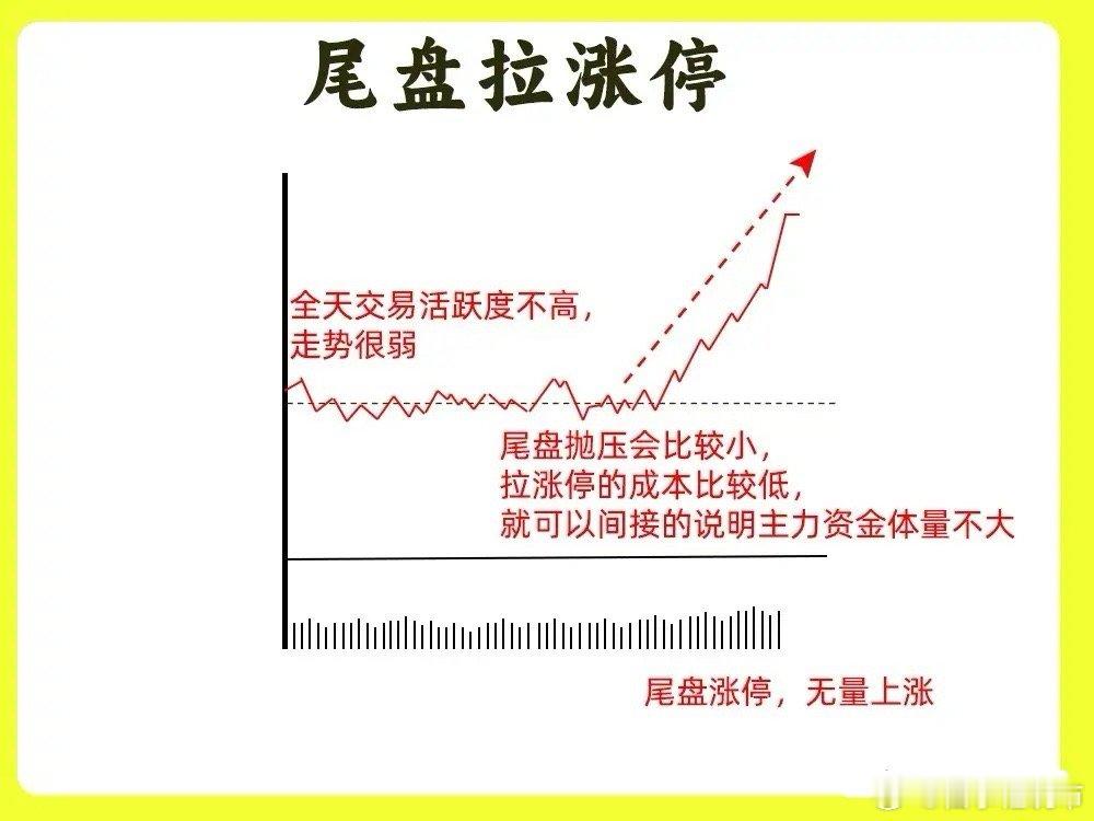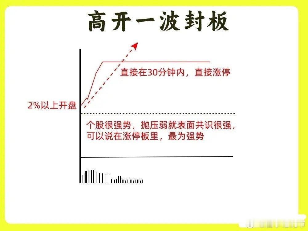 注意了!大部分散户都不知道涨停秘密,个股出现涨停,他们也有强弱之分,什么样的才是强势什么样的才是弱势,什么是弱转强呢?我相信你看完这期内容,你一定有答案,建议认真看完点赞收藏或评论支持一下,以免以后想温习找不到了一、高开一波封板也是最为强势的涨停板,早盘股价大幅高开,在30分钟里,直接拉涨停,这个拉升过程里,股价没有回调,直接一波涨停,此时在盘口位置,封单量很大。封单量越大,说明涨停板不会炸板回落。所以拉涨停的时间越短,封单量越大,就越强势,市场情绪一致看多。二、高开缓冲封板早盘高开以后,出现回调,开始横盘震荡,盘整的整个过程里,股价没有出现大幅下跌,没有出现破位情况。股价回踩均价线以后,开始反弹向上,快速拉升涨停。这也是空中加油形态,股价拉升洗盘再拉升的形态。说明主力已经控盘三、 阶梯式封板这是主力边拉边洗的一个过程,股价先是拉升一段,成交量放量,随后开始横盘,成交量开始缩量,又出现放量拉升,再次横盘,直到股价出现涨停。整个走势就像向上的楼梯。走势很稳,筹码得到充分换手。四、涨停炸板洗盘股价在分时图里,出现涨停,随后出现炸板回落,回调的幅度不是很大,随后又涨停,一天里可能出现多次炸板又回封的走势,这是主力洗盘的手法。这种涨停板一般会在低位或是上涨趋势的初期。股价回封的速度越快,越好五、尾盘拉涨停股价全天走势很平淡,基本出现一个箱体震荡的或是横盘震荡的走势,等到尾盘的三十分钟里,股价快速拉升涨停,所以此时的拉升,成交量的情况,封单量和撤单就显得很重要了。这种尾盘拉升的涨停,算是最为弱势的一种,主力一旦是强势,是不会选择在尾盘好了!以上就是涨停板的五种形态,现在知道什么涨停是强势了吧。下方我准备了案例图,建议文章和案例结合起来看。希望对大家有启发,也是最为基础的内容,一定吃透。