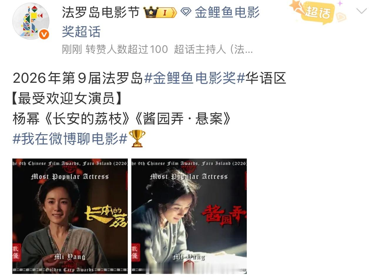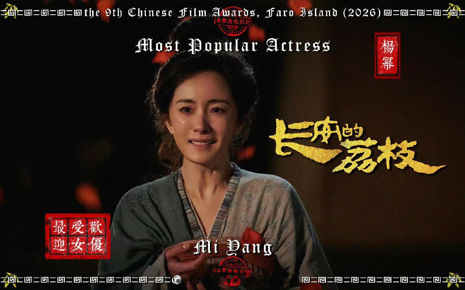 杨幂凭借《长安的荔枝》《酱园弄·悬案》获得2026年第9届法罗岛金鲤鱼电影奖华语区【最受欢迎女演员】荣誉恭喜杨幂,实至名归杨幂杨幂