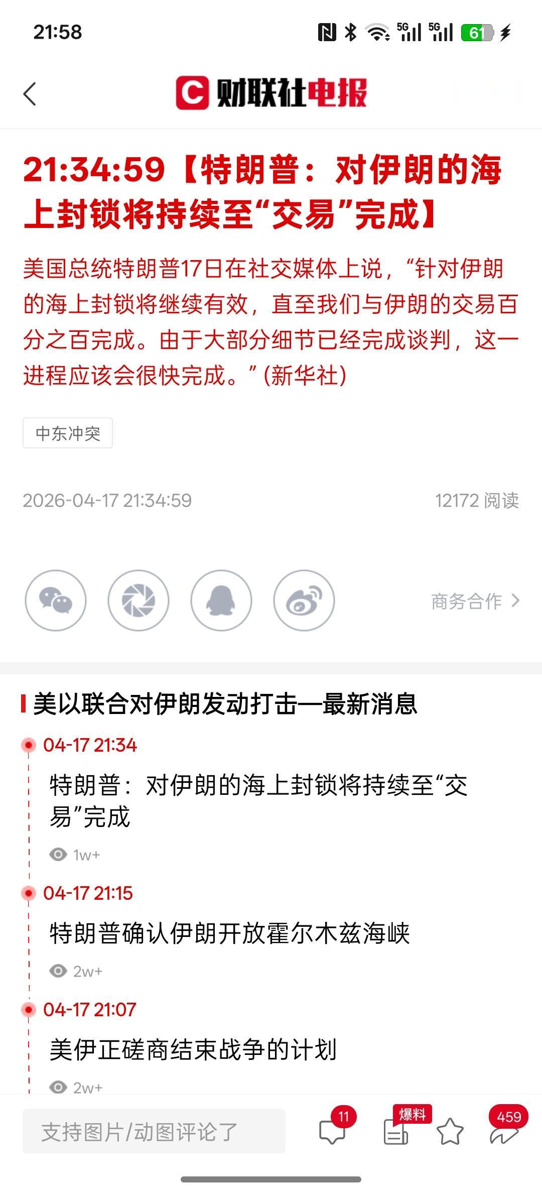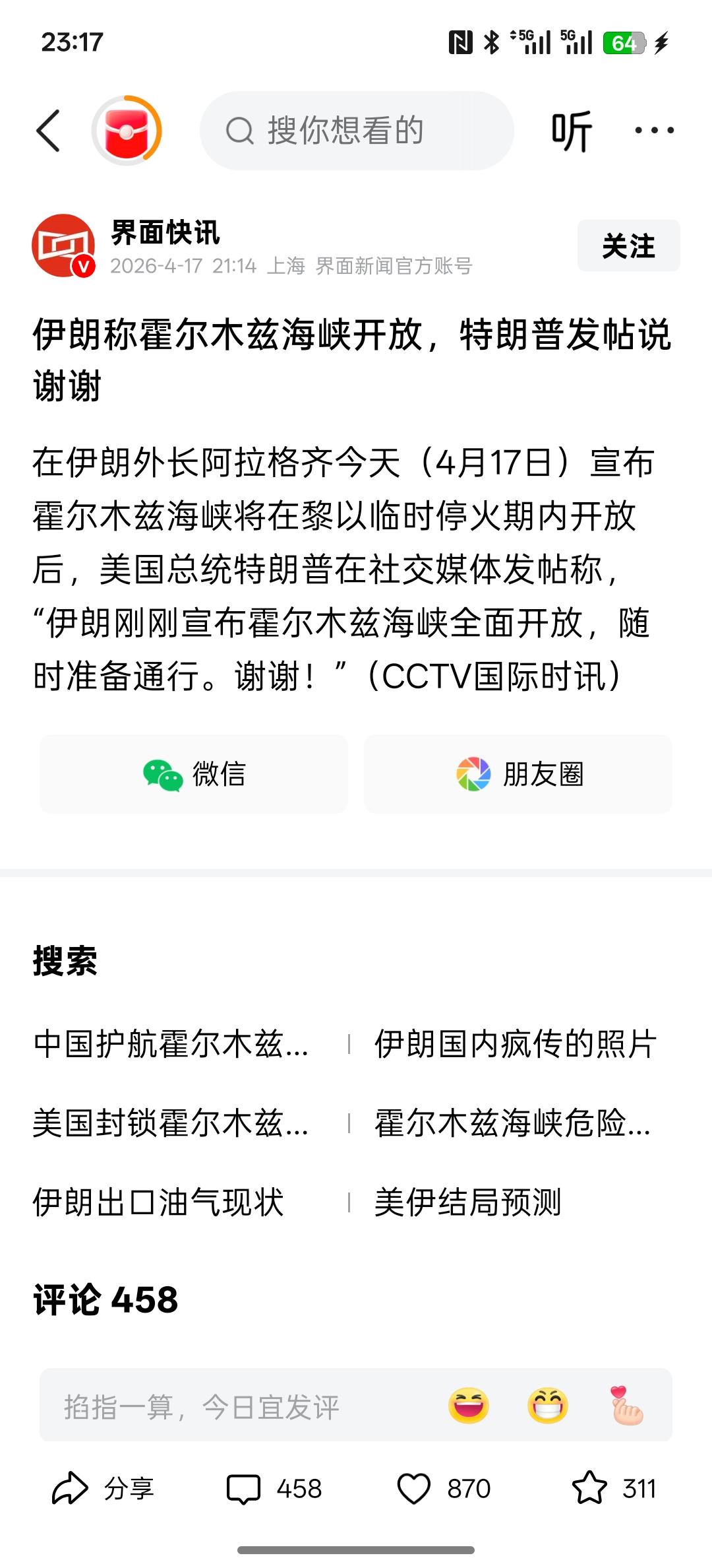 重大利好,伊朗宣称全面放开霍尔木兹海峡,所有的商船可以通过霍尔木森海峡,特朗普在社交媒体上面就发表帖子!就伊朗宣布放开霍木兹海峡后,然后特朗普说了声谢谢!