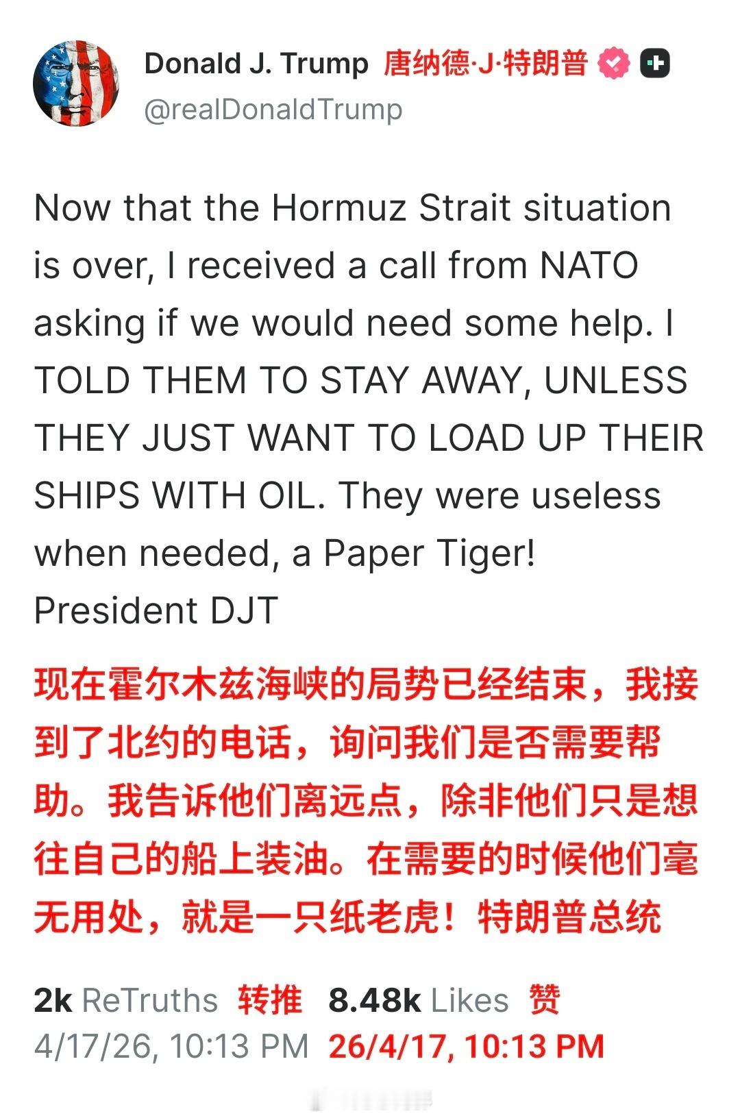 特朗普社媒连发10帖 特朗普:赢赢赢赢北约煞比赢赢赢赢