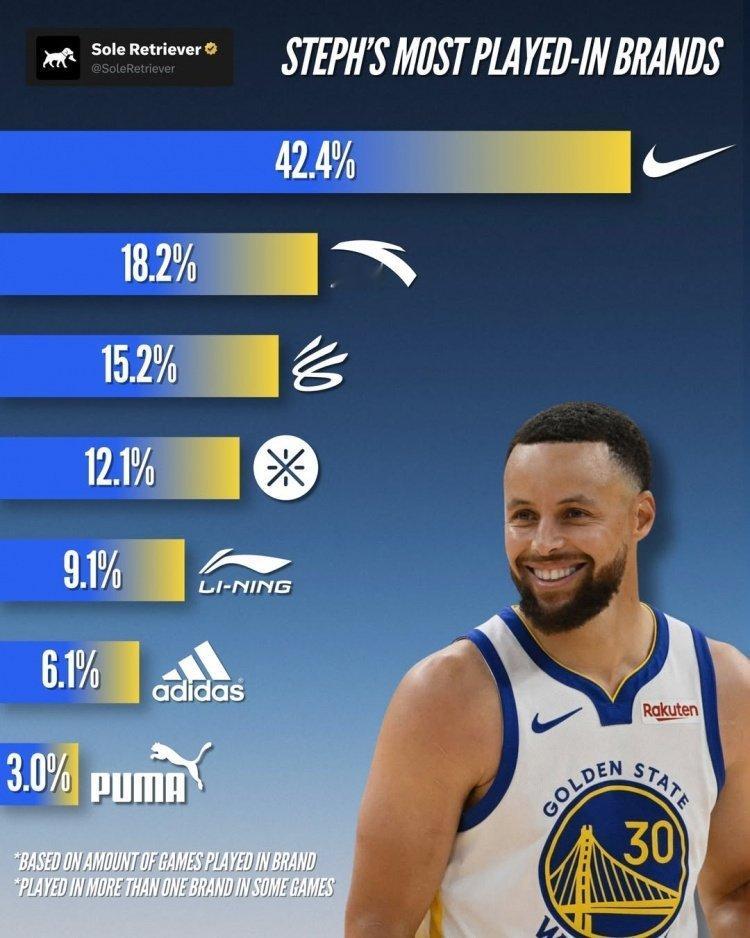 本赛季,库里有4成的场次穿的是耐克球鞋,超过2成穿的是李宁(包括韦德系列),接近2成穿的是安踏。