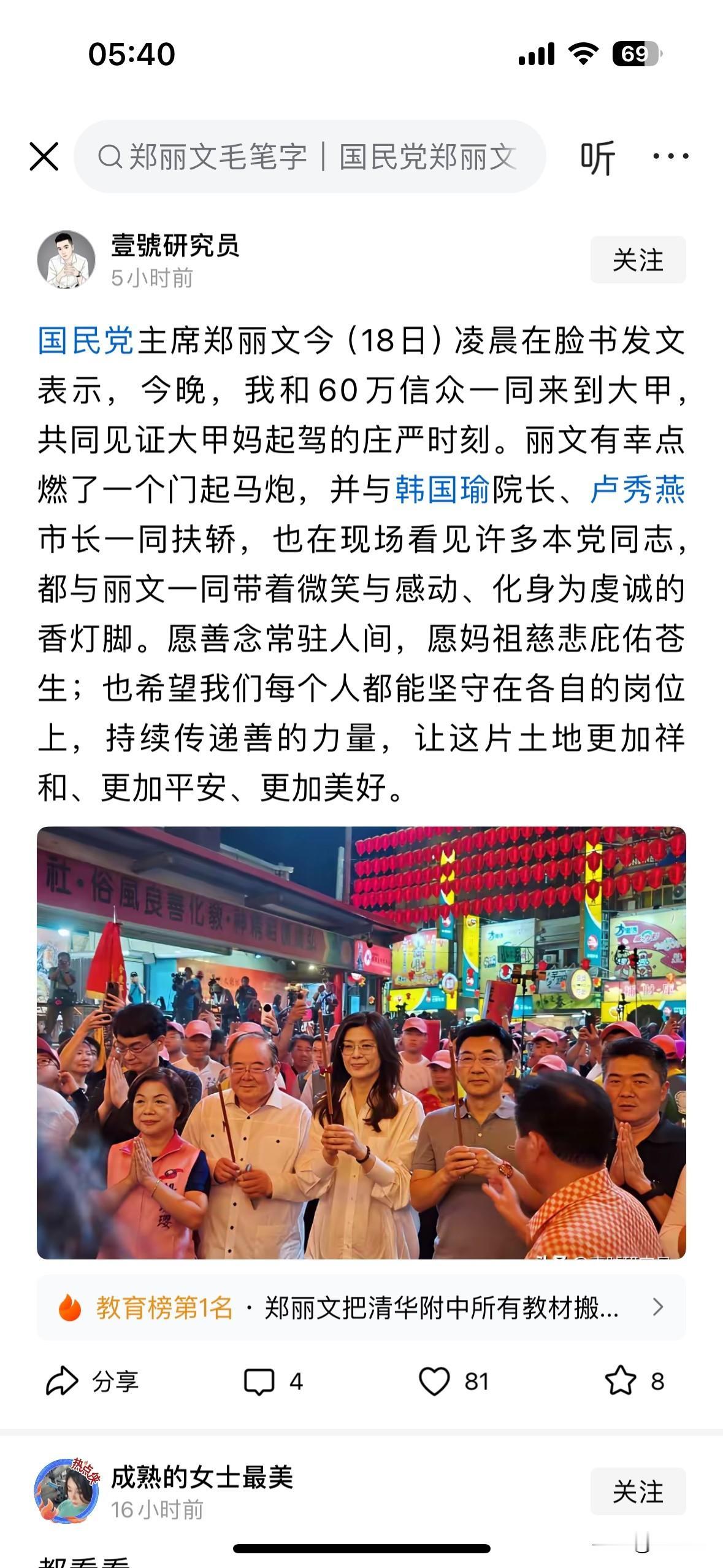 郑丽文凌晨发文谈及参与大甲妈祖起驾仪式,与韩国瑜、卢秀燕等人扶轿祈福,以民间信仰凝聚人心,既是对台湾传统民俗的呼应,也展现国民党贴近基层、传递祥和理念的姿态。妈祖文化承载两岸共同信仰与和平祈愿,此次活动以善念与庇佑苍生为核心,淡化政治对立,契合民众对平安稳定的普遍期待。