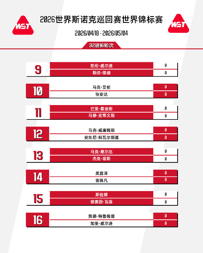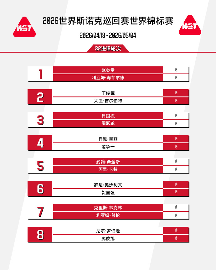 17:00 赵心童 vs 利亚姆·海菲尔德17:00 马克·艾伦 vs 张安达21:30 肖国栋 vs 周跃龙21:30 马克·威廉姆斯 vs 安东尼·科瓦尔斯基*次日2:00 赵心童 vs 利亚姆·海菲尔德次日2:00 巴里·霍金斯 vs 马修·史蒂文斯