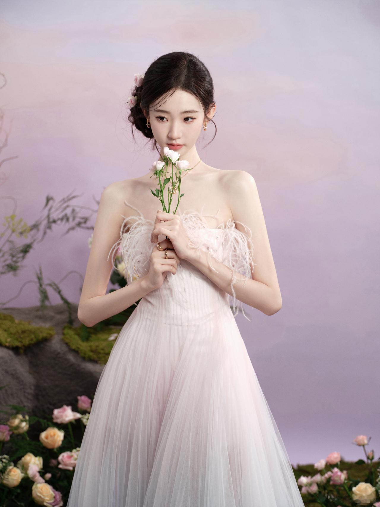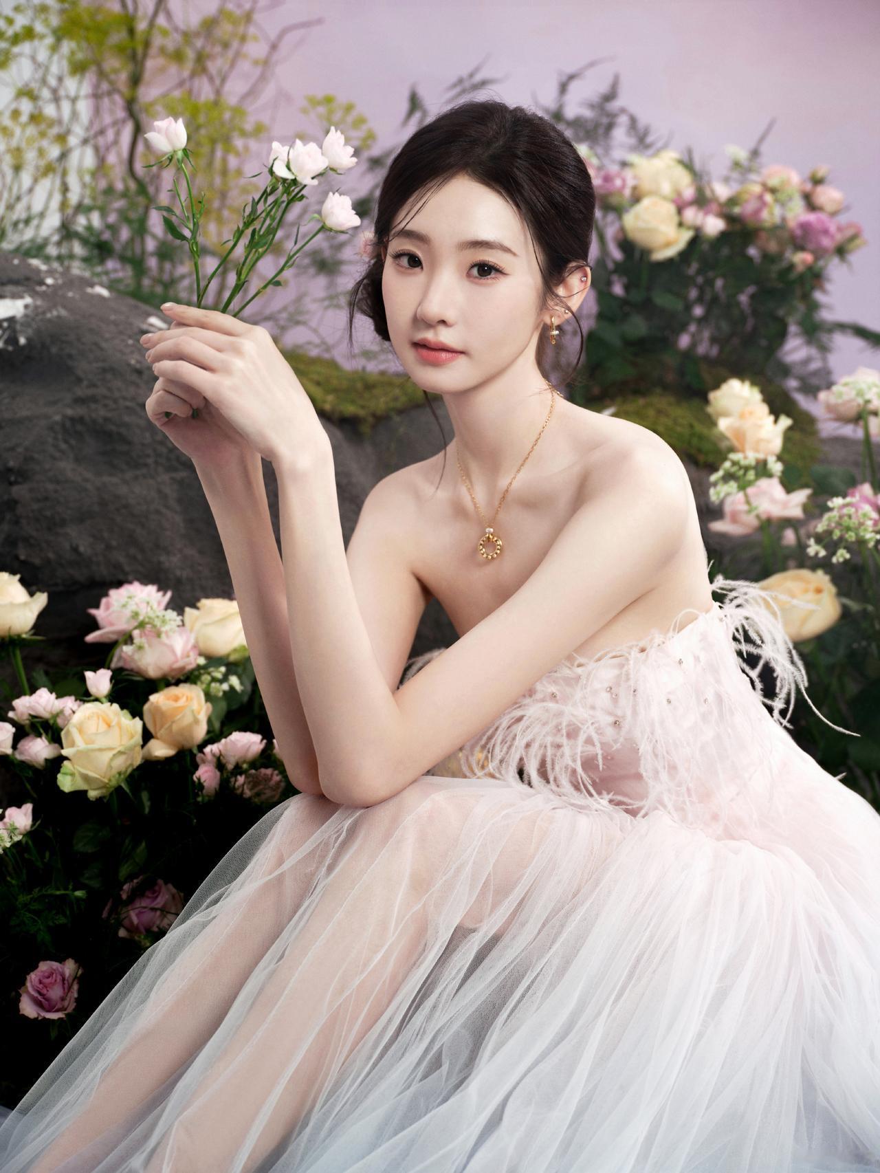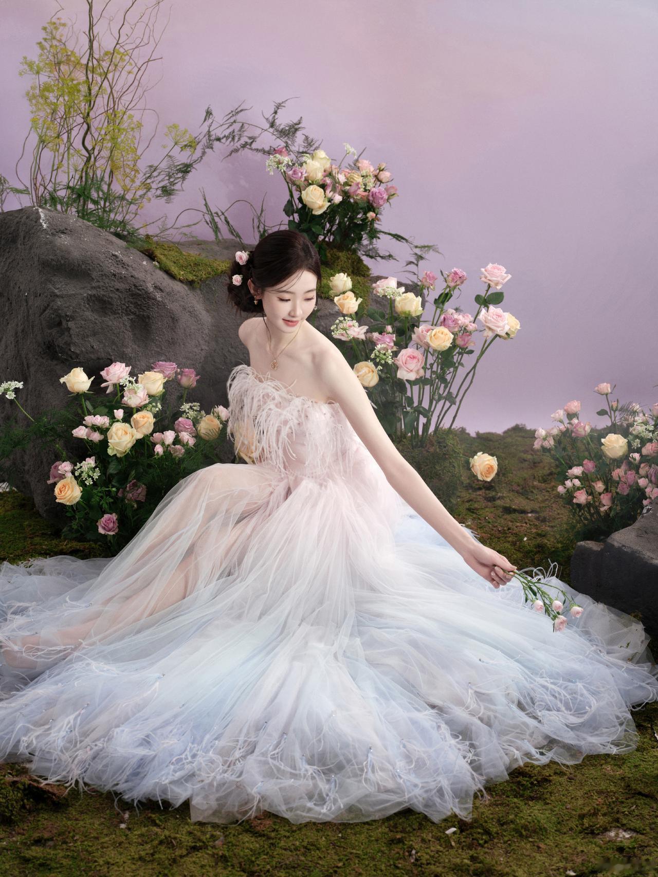 仙气十足!张艺凡身穿渐变抹胸纱裙,在繁花云雾中轻盈灵动,或捧花互动,或温婉凝视,完美演绎了“花间仙子”的梦幻氛围[奸笑]