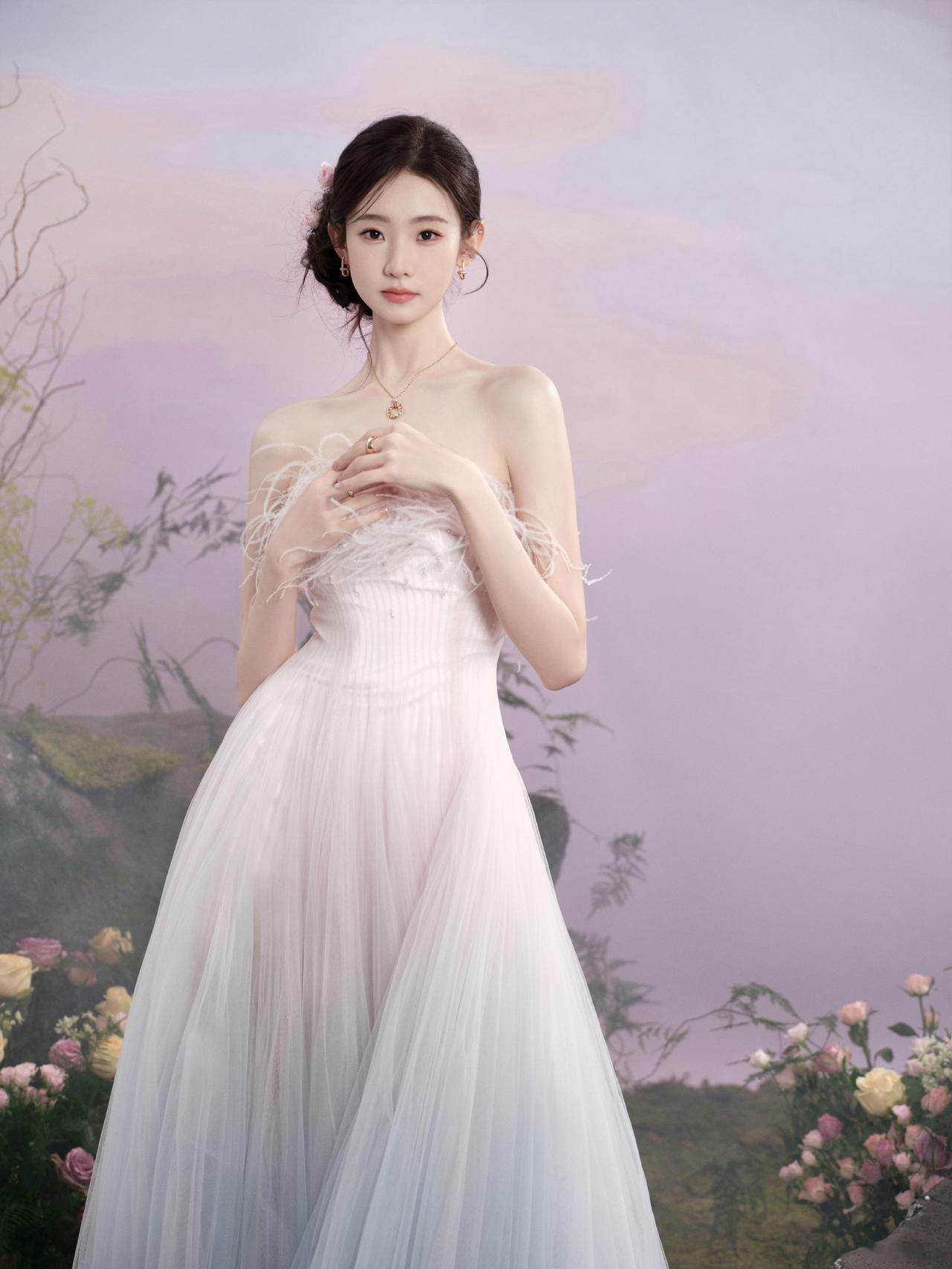 仙气十足!张艺凡身穿渐变抹胸纱裙,在繁花云雾中轻盈灵动,或捧花互动,或温婉凝视,