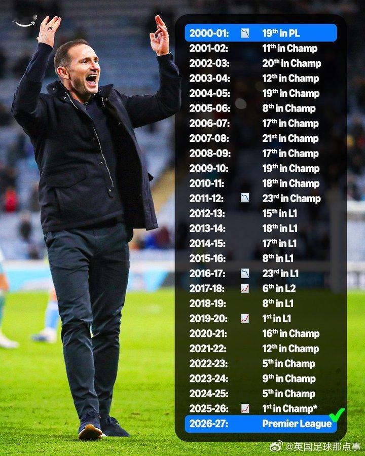 👏神灯有能!兰帕德 在2024年11月28日接手考文垂时,球队仅高出降级区2分,排英冠第17。考文垂时隔25年重返英超