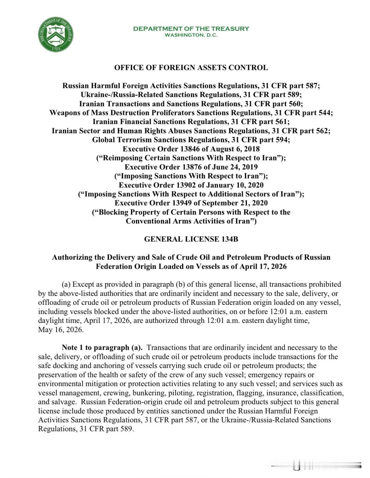 刚刚:贝森特在声称美国不会续签对俄罗斯或伊朗石油的制裁豁免令两天后,其财政部悄然延长了一项许可,允许俄罗斯石油交易再持续一个月。