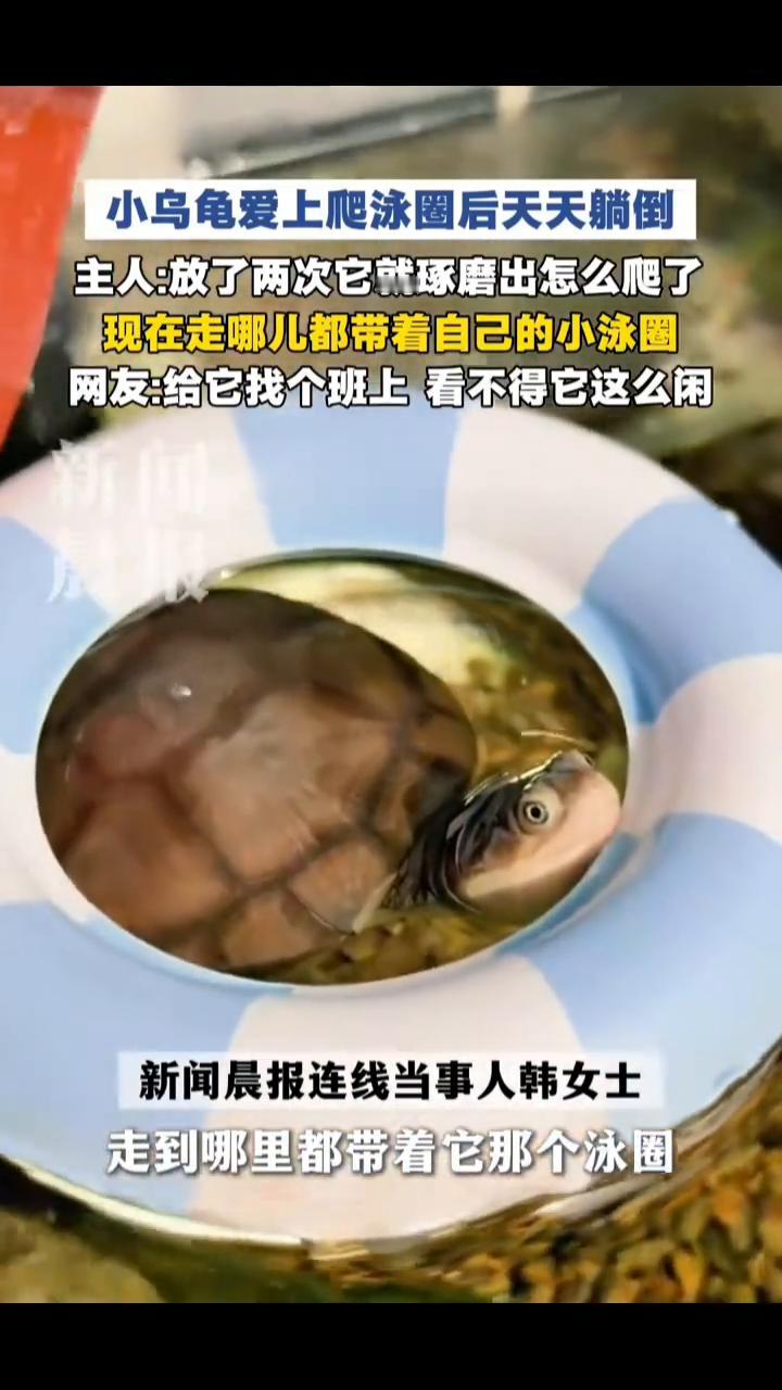 小乌龟爱上爬泳圈后天天躺倒。主人:放了两次它就琢磨出怎么爬了,现在走哪儿都带着自己的小泳圈。网友:给它找个班上,看不得它这么闲。