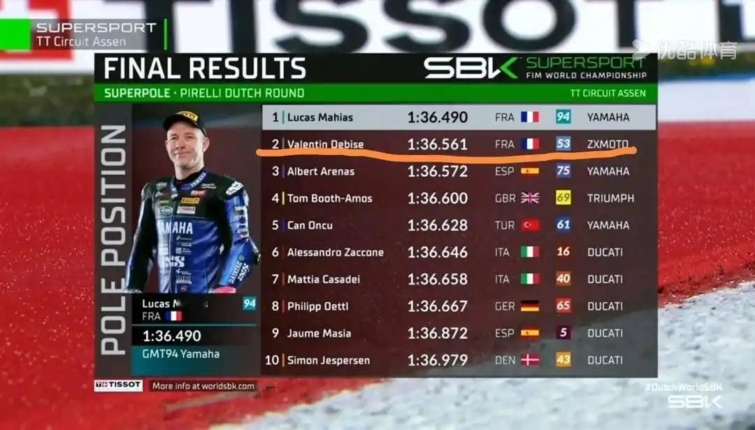 《张雪机车》 北京时间4月17日,2026 WSBK荷兰站WorldSSP组别超级杆位赛结束,中国品牌张雪机车夺得第二名。车队820RR-RS赛车由法国车手德比斯驾驶,跑出1分36秒561的单圈成绩,仅以0.071秒之差获得杆位赛亚军。