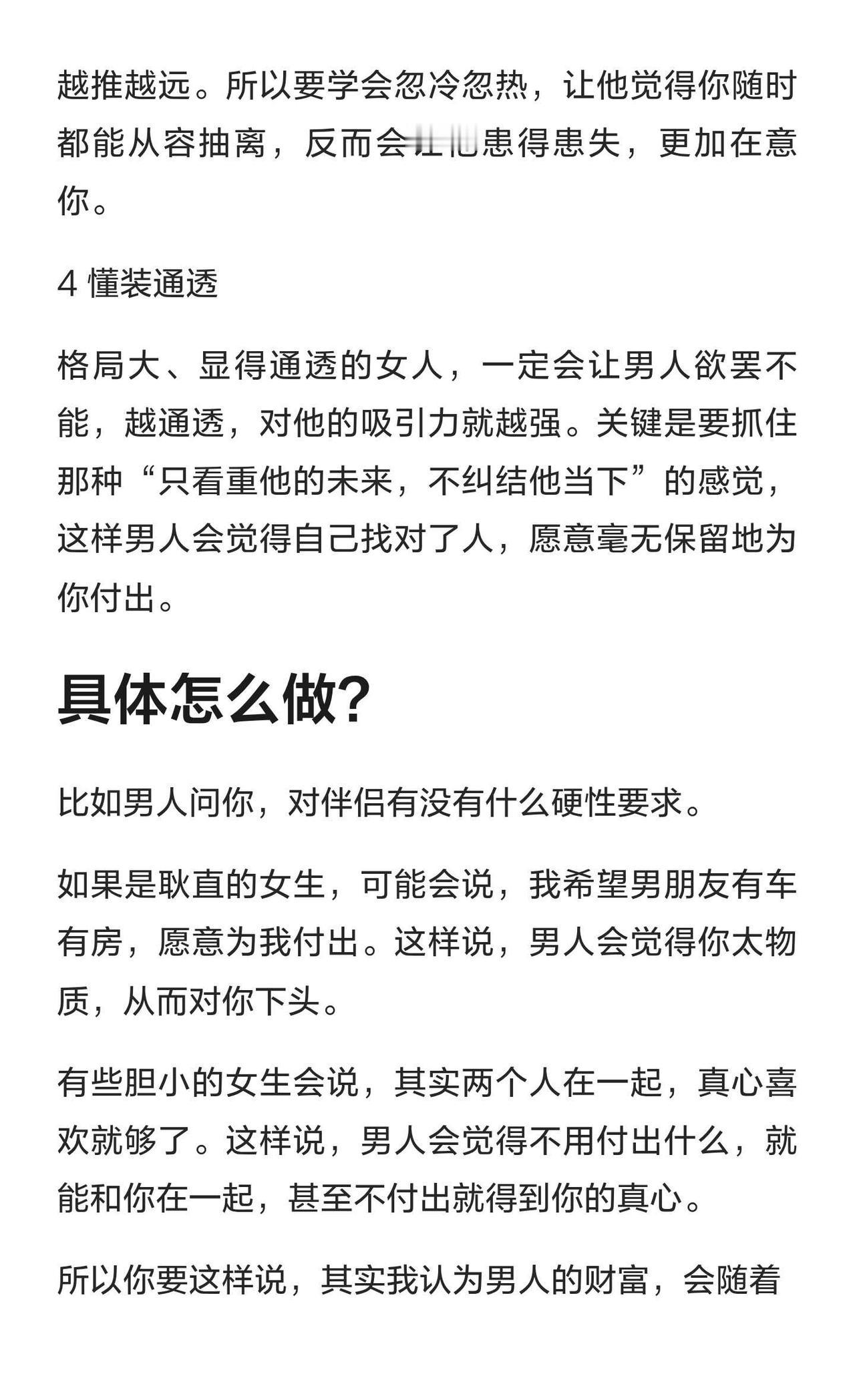 女人吸引男人的关键在于展现反差感、边界感和反差感,懂得适时示弱和独立,保持坦诚沟通,营造反差,同时懂得“装”——保持纯粹、妩媚、忽冷忽热或通透,让男人欲罢不能。海外生活夫妻 婚姻修复 投资理财 保时捷LV海外华人