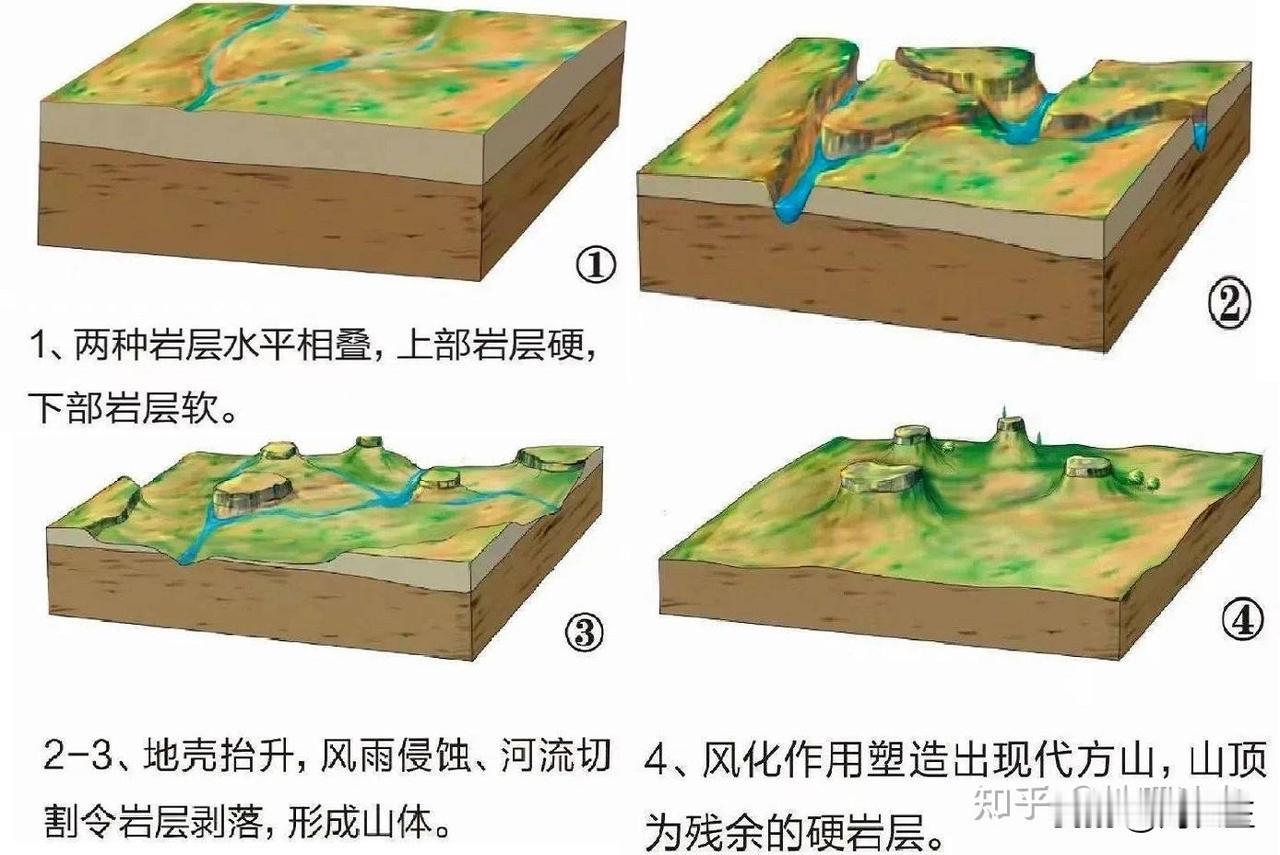 至于下方的页岩和大部分山峰一样,在风雨和河流的侵蚀下形成坡度较缓的山体。页岩硬度比石灰岩低,更为脆弱,很容易遭受风化剥蚀,是顶部的石灰岩“帽子”减缓了山体被剥蚀的速度。